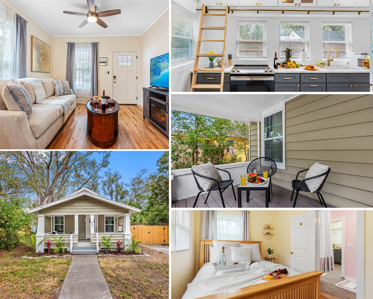 Experience modern coastal luxury in this stylish, spacious upstairs 2-bedroom cottage with designer decor. Steps from Main Street Dunedin, short walk to gorgeous sunsets at the waterfront, quick drive to award winning beaches--Honeymoon Island & Clearwater Beach. Walk to restaurants, shops, & breweries. Pet-friendly w/ 2 king beds, a sleeper sectional, & serene treetop views. Treat yourself! Book your getaway at the Barefoot Parrot by Lucky Guest.