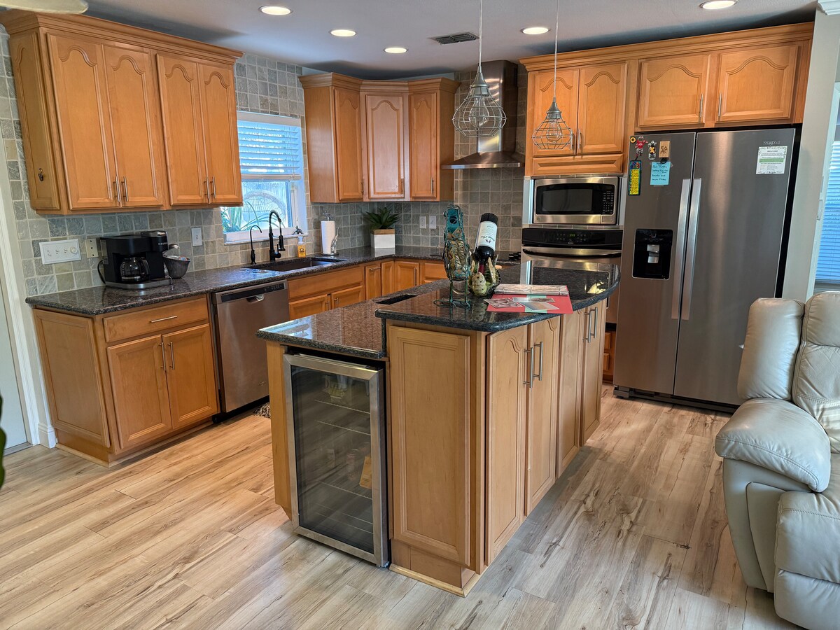 Ikhaya lethu libuyekezwe kahle, linefenisha ephelele futhi lihlotshiswe ngetimu yasebhishi. Igumbi lokulala elikhulu linombhede okhululekile wenkosi futhi ikamelo lesibili linendlovukazi. Sinechibi elihle ngemuva. Ilungele ukungcebeleka ne-BBQ ngenkathi ujabulela isimo sethu sezulu esihle sase-Florida. Indlu ine-Smart TV, i-inthanethi w/Wi-Fi, umshini wokuwasha izitsha, umshini wokuwasha, umshini wokomisa, nokunye okuningi. Konke okudingayo ukuze wenze ukuhlala kwakho kube kuhle. Siseduze nezitolo ezinhle, ukudla kanye namanye amabhishi amahle kakhulu ase-Florida.