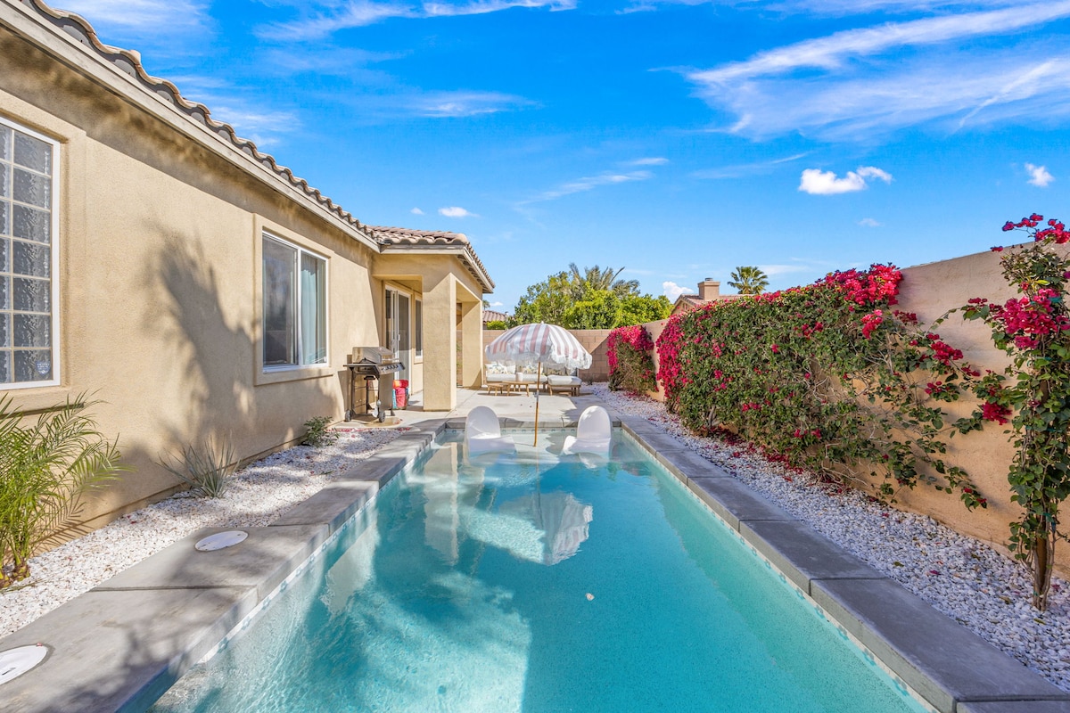 I-Bungalow Bliss iyindawo ekahle kakhulu yasegwadule yeholide langempelasonto noma indawo yokuhlala. Kuklanywe kahle futhi kuhlotshiswe kahle, ingaphakathi elisezingeni eliphezulu libonisa ukuchwela ngokwezifiso nemiklamo ependwe ngesandla. Itholakala endaweni yokudlala igalofu, intaba nokubukwa kwegalofu ngenkathi uphumula endaweni yokubhukuda yamanzi anosawoti enamanzi ashisayo yangasese ne-spa. Jabulela i-wifi engu-1 Gig kanye neshaja ye-50-amp ChargePoint EV. Hamba ngezinyawo uye e-Coachella / Stagecoach, imizuzu engu-10 ngemoto ukuya e-La Quinta, imizuzu engu-15 ukuya e-Indian Wells, imizuzu engu-30 ukuya e-Palm Springs, imizuzu engu-45 ukuya e-Joshua Tree