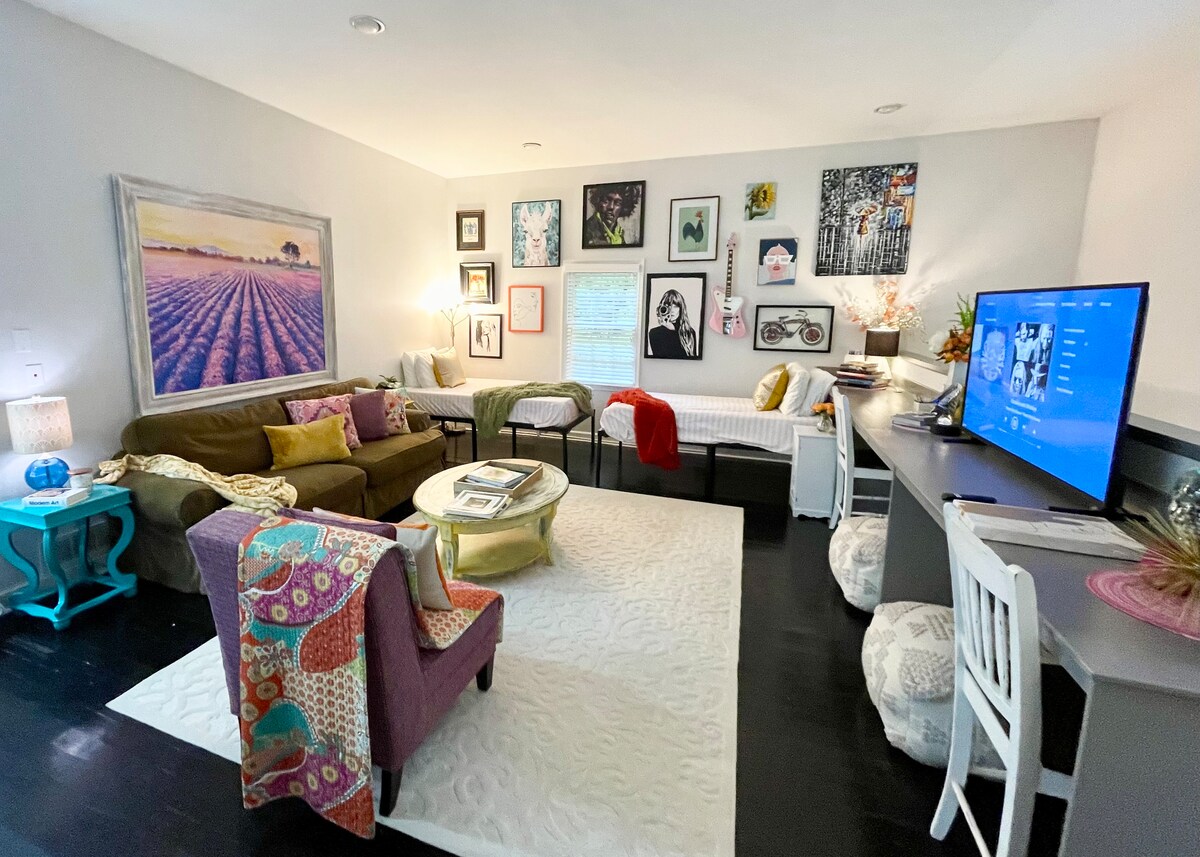 Yiza nezilwane zakho ezifuywayo futhi ujabulele ukuhlala imayela elilodwa ukusuka e-Canton Street nakho konke okunikezwa yi-Roswell edolobheni. Iphinde ibe lula endaweni ye-Perimeter, i-Buckhead ne-Alpharetta. Ikamelo lezivakashi lisezingeni eliphansi lekhaya lethu futhi linendawo yokungena ephrayivethi ene-smart lock yokokuzithokozisa kokungena ngaphandle kokuthintana. Ilungiswe kabusha ngokuphelele, indawo yezivakashi inikeza izindawo zokuhlala zesimanje nezinethezekile. Qiniseka ukuthi uwusebenzisa ngokugcwele umbhede ojikelezayo ngaphansi kwezibani zezintambo kuvulande wakho wangasese.