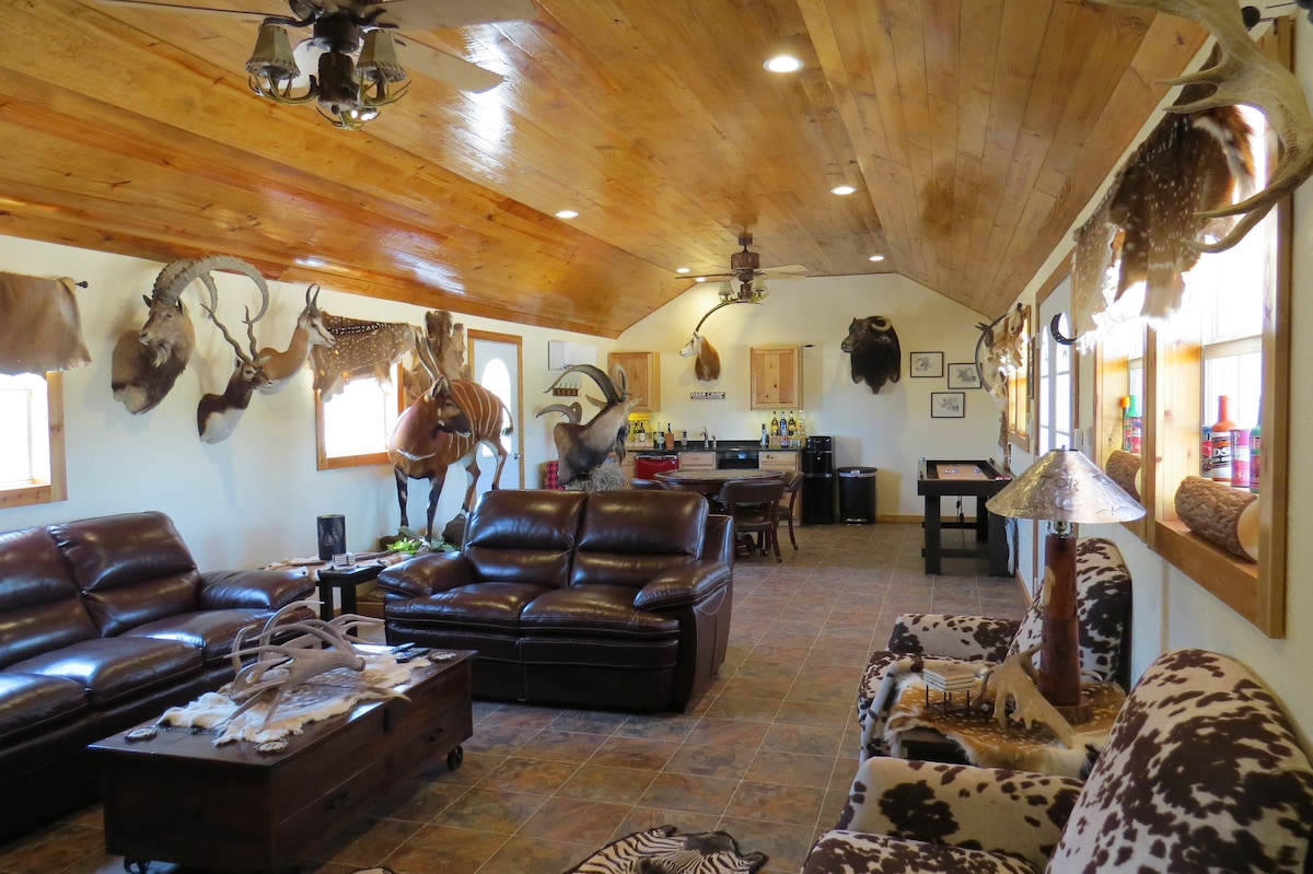 Hlala kuvulandi wendlu yethu eyakhiwe ngamapulangwe yomsedari yamakamelo angu-2 futhi ujabulele umoya wase-West Texas futhi ubuke izilwane ezinhle ziklaba ensimini. Ikamelo elihle elivulekile lihlotshiswe ngophayini othokomele wasemaphandleni kanye nefenisha yesikhumba, ikhishi elinakho konke eline-bar. I-Hangout, isakhiwo sethu sokuzilibazisa siyatholakala ukuze ujabulele kanye novulande wesembozo esinendawo yokubasa umlilo. Bona ezinye izindlu zethu zamaqembu amakhulu. Okwengeziwe ekuhlaleni kwakho (ngemali eyengeziwe:) Uhambo lwe-Meals Safari