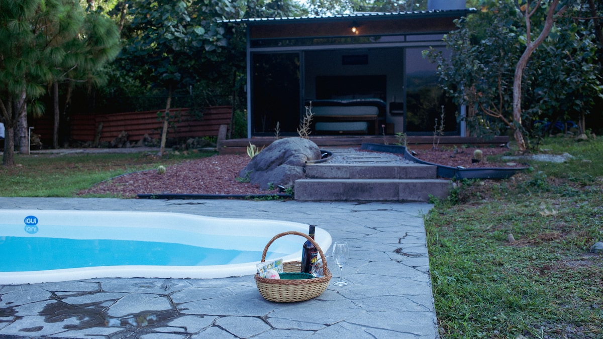 Indlu eyakhiwe ngamapulangwe enegumbi lokulala elilodwa (abantu abangu-3) , izindlu zokugezela ezingu-1 no-1/2, ikhishi kanye ne-terrace ehlanganisiwe, inengadi enkulu ekahle yokukhempa, indawo yomlilo, ne-terrace ebheke i-ravine, i-1,000 mt2 yezwe ebhodini, elizungezwe yimvelo, eduze nendawo emangalisayo kanye nokuhamba ngezinyawo kwe-Comala-Suchitlán,