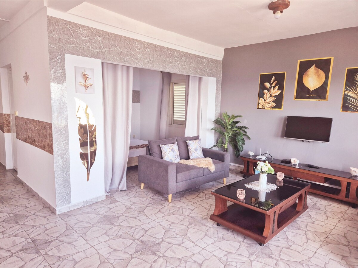 Détendez-vous dans ce logement calme et élégant. Appartement neuf avec une décoration moderne et une végétation autour qui permet de respirer l'air fraîche de la nature. Il se situe dans une zone où il n'y a pas de coupure d'eau et le restaurant Nasso est à 300 mètres si vous voulez vous restaurer.