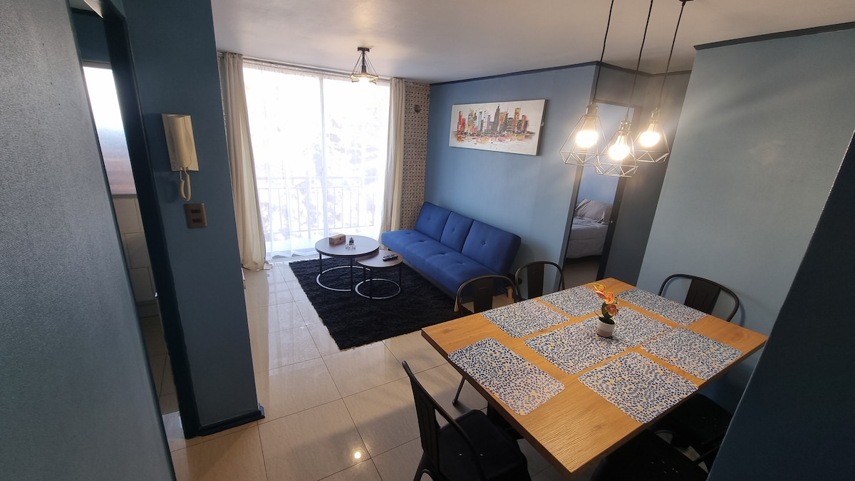 Departamento para 3 personas, ideal para una estancia de trabajo o descansar mientras vamos de paso Cocina amoblada Una habitación con cama de dos plazas y televisor, otra habitación pequeña con cama de una plaza Sala pequeña con Smart TV con varias aplicaciones para pasar el rato, Wifi, Estacionamiento Supermercado Jumbo a dos cuadras Casino a pocos minutos El departamento cuenta con lavadora de ropa Flexibilidad de entrada o salida si el calendario lo permite Factura para empresas