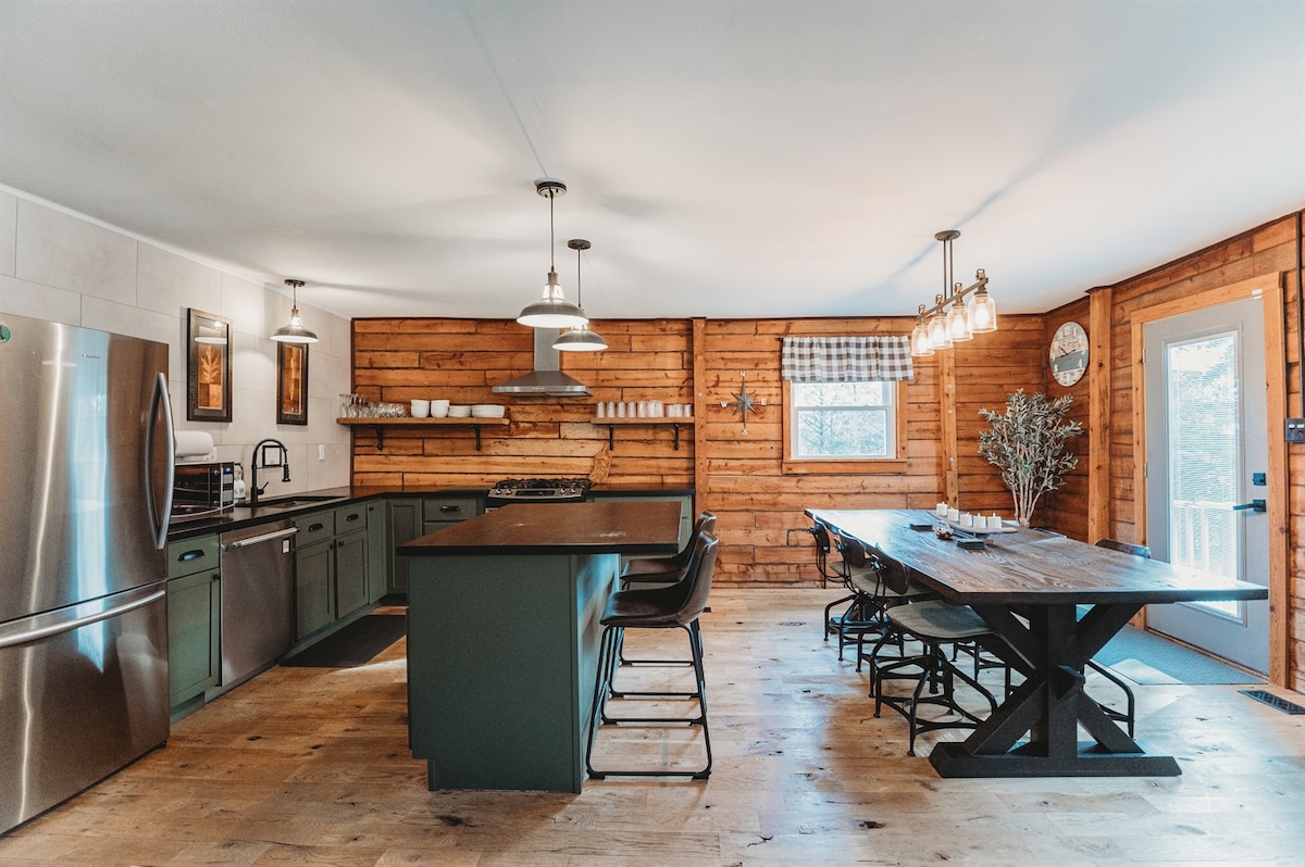 Indlu yethu eyakhiwe ngamapulangwe yangempela yakhiwa ekuqaleni kuka-1930 futhi isanda kubuyiselwa. Ikamelo lokulala #1 linombhede wosayizi we-queen, i-antique dresser, nendawo yomlilo. I-bunkroom inombhede owodwa ogcwele, umbhede owodwa ongamawele, kanye neqoqo lemibhede eyisitezi. Ihholo lokudlela elingemuva lihlala abantu abangu-12 futhi linendawo enkulu yemidlalo nemisebenzi (sinezindawo eziningana ongakhetha kuzo). Kukhona i-TV, ikhebula, kanye ne-VCR/dvd player (sinamabhayisikobho nawo), kodwa ayikho i-inthanethi...EPHELELE! Ikhishi nalo linezinto eziningi!