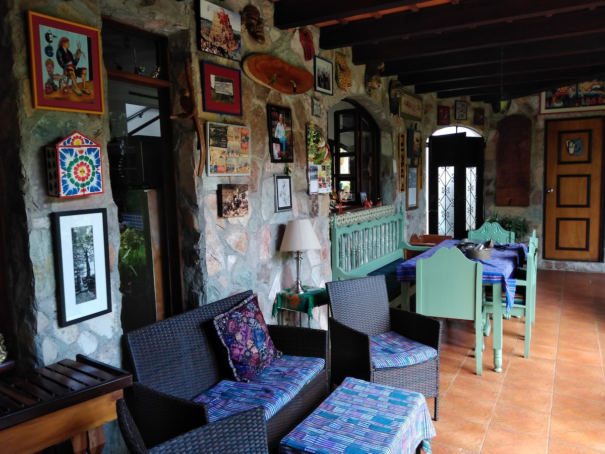 Beka endaweni yekhofi ngasendaweni enamanzi eyingqayizivele, leli khaya liqhele ngemizuzu engaba ngamashumi amabili ukusuka e-Antigua. Namanje, kuzwakala kuqhelelene nomhlaba. Uzochitha izinsuku ezinokuthula ezingadini eziluhlaza futhi uhambe uye emadolobheni ase-Mayan ase-San Antonio nase-Santa Catarina Barahona. Uma uthanda, ungakwazi futhi ukwazi izingane ezivakashela umtapo wezincwadi othi "Caldo de Piedra" eduze komnyango. (Izihambi ziyakusekela.) Ukuthathwa nokwehliswayo kuse-Antigua kunikezwa mahhala (phakathi nesonto, kuze kube ngu-6 ntambama). Imvelo-, ilungele ukubhukha.