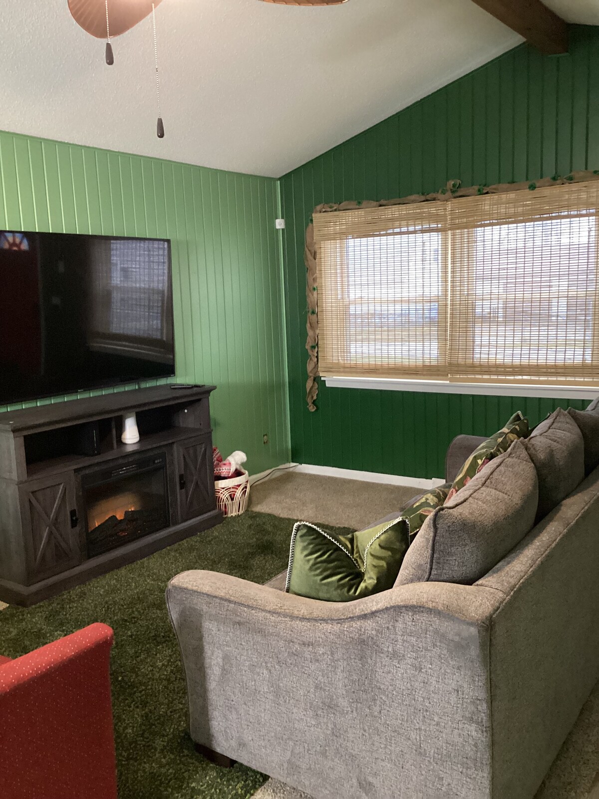 Ifenisha ephelele, indlu enkulu yezwe. Ngokubukwa kwezwe elihle. Ukugoqa okukhulu okuzungeze i-Porch nompheme ongemuva. Ilungele amapikiniki noma ukuphumula nje. Indawo ekahle yanoma yimuphi usayizi womndeni noma iqembu. Imibhede emibili emikhulu, indlovukazi eyodwa, umbhede owodwa ogcwele kanye nesofa yendlovukazi yokulala ukuze uhlangabezane nezidingo zomndeni ezinkulu. Phakathi nezinyanga zasebusika ungajabulela ukufudumala kwendawo yomlilo. Izinkuni zinikezwa. (Emaqenjini amancane angasebenzisi ikamelo lokulala elilodwa sicela uxhumane nathi ngenani elikhethekile.)