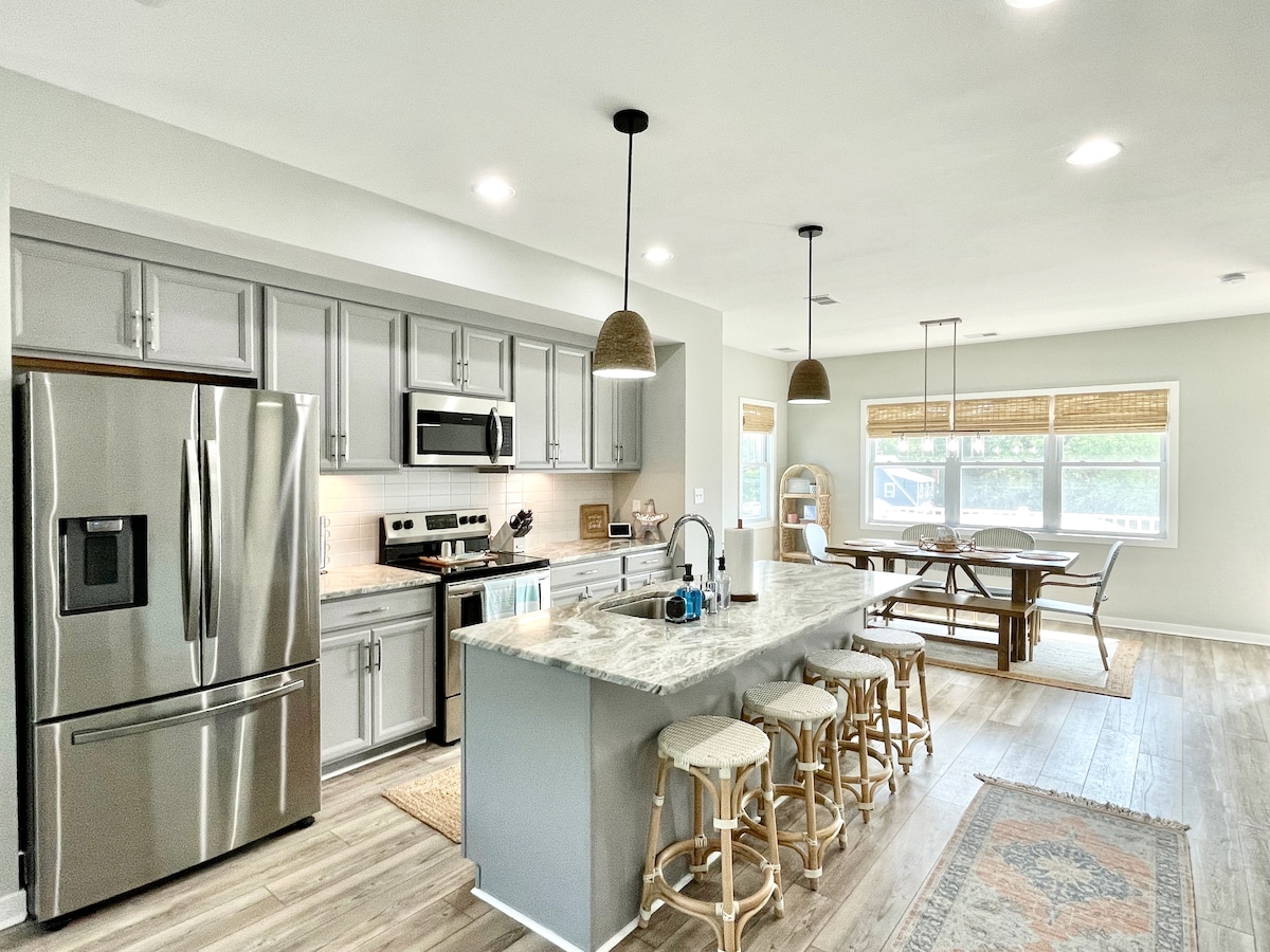 Le ndlwana engasebhishi isendaweni ebuka i-Monroe Bay ukusuka egcekeni elingemuva. Ibanga lokuhamba ngezinyawo ukuya ezindaweni zokwenza utshwala nezindawo zokudlela. Amabhlogo angu-3 kuphela ukusuka ebhishi! Vula uhlelo lwaphansi ngekhishi, igumbi lokudlela, igumbi lokuphumula, negumbi lehhovisi/igumbi lokuhlanza izingubo. Kunomsebenzi ozinikele usuka endaweni yasekhaya ehlanganisa igundane, ukuqapha, nekhibhodi. Igceke elingemuva libiyelwe ngokugcwele nge-patio netafula nezihlalo. Igumbi lokuphumula line-smart tv ehlanganisa i-Apple TV nebha yomsindo.