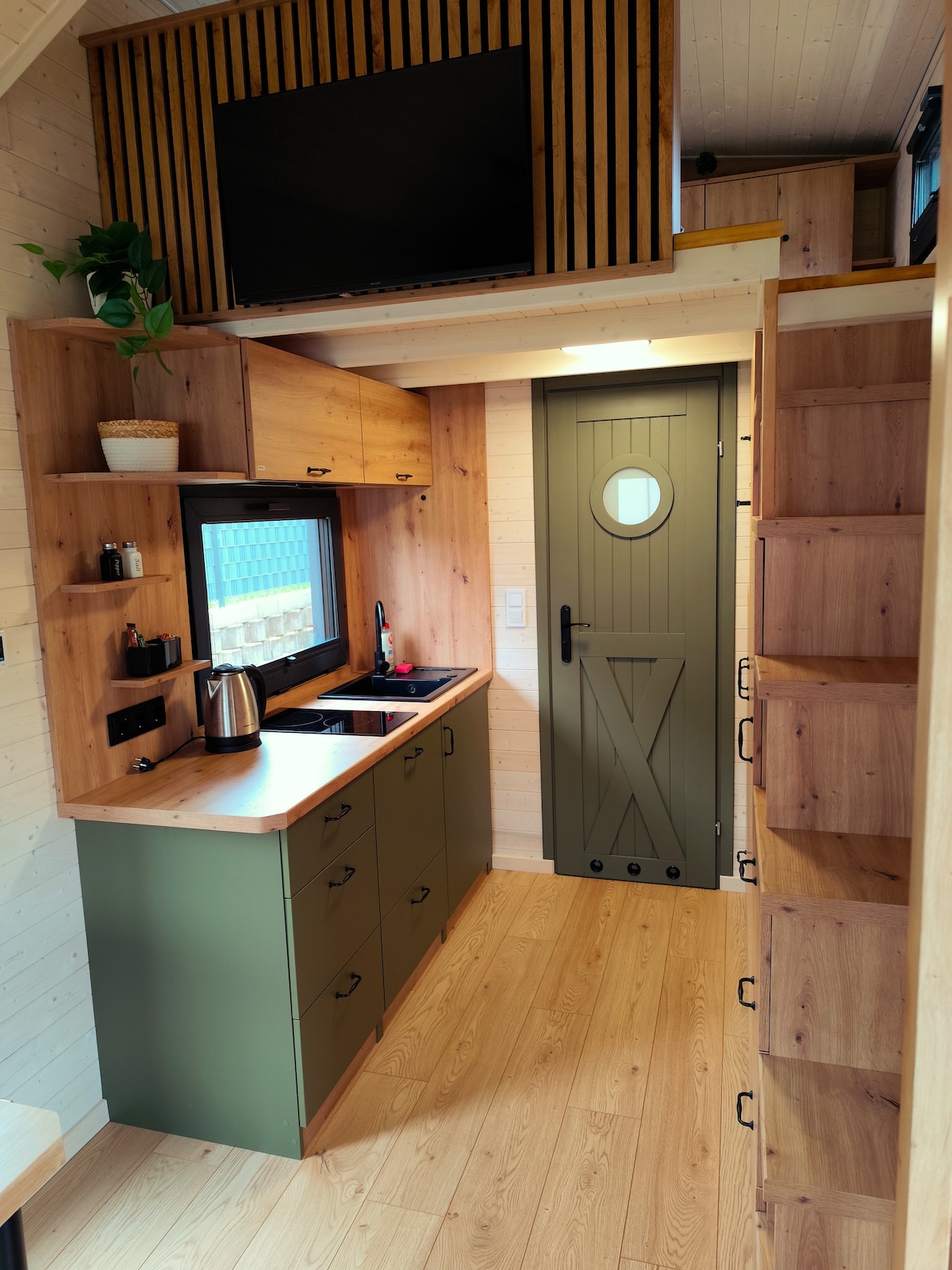 Indlu yethu eyakhiwe ngamapulangwe esanda kulungiswa ihlanganisa cishe. 50 sqm. Kumahhala engadini nge-meadow encane yezivakashi zethu ngemuva kweqhugwane. Indlu eyakhiwe ngamapulangwe ihlanganisa ikamelo elikhulu, elikhanyayo elinetafula lokudlela lasekhishini nekhoneni losofa eline-TV, izinga eliphakeme lokulala elinombhede olala abantu ababili, ithala kanye negumbi lokugezela elineshawa. I-Terrace nendawo yokuhlala phambi kweqhugwane kufanelekile engxoxweni ethokomele.