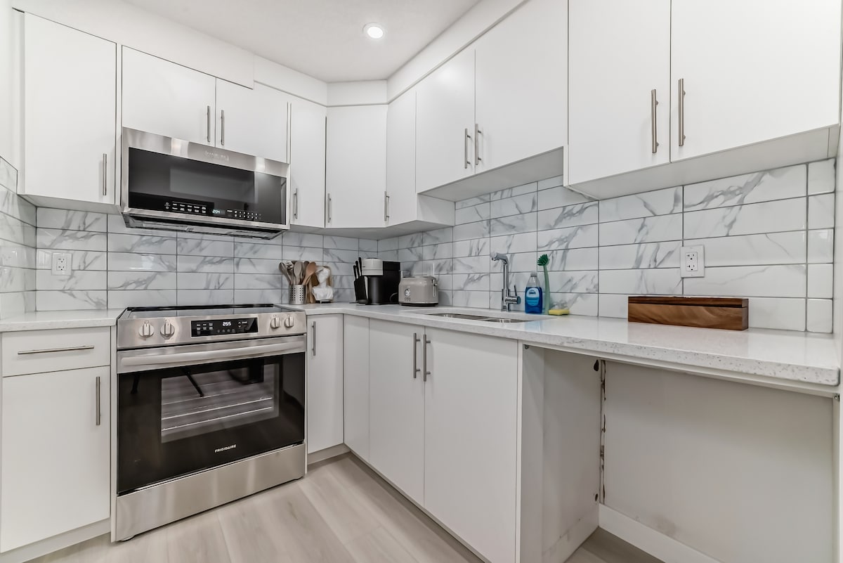 Leli fulethi lesimanje elinamakamelo amabili liyindlela enhle kakhulu yebhizinisi noma injabulo. Simizuzu embalwa ngemoto sisuka e-South Health Campus, i-Real Canadian Superstore, kanye ne-YMCA enkulu kunazo zonke emhlabeni. Sinikeza MAHHALA: ✓ Ikhofi & Itiye ✓ Indawo Yokupaka✓ Ye-Wifi ✓ Izinto zokugeza ezisemgangathweni nezinsipho ✓ 65" I-QLED Smart TV: I-Amazon Prime, i-Netflix nokuningi ✓ Amanzi & Iziphuzo Amanye amasevisi ahlanganisa: ✓ Ukuzingenela ✓ Imibhede nemicamelo ethokomele ✓ Ama-duvets afudumele Umshini ✓ Wokuwasha & Umshini Wokomisa ✓ I-ayini ✓ Toaster ✓ ✓Uhhavini we-Hairdryer Microwave