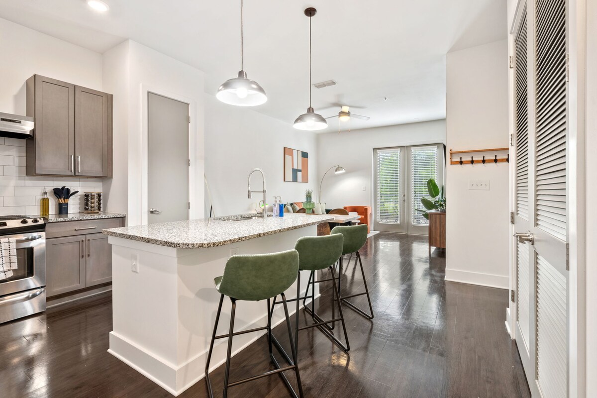 Jabulela ifulethi lethu elithokomele elifulethini eliphakathi kwezihlahla futhi ligcwele ukukhanya kwemvelo okuhle. Leli fulethi lesibili lakhiwa ngo-2021 elinezitezi ezimnyama ze-okhi, ama-countertops akhanyayo, kanye nengxube yefenisha yesimanje neyakudala. Ubuciko kulo lonke ifulethi kwasungulwa ngabadwebi bezincwadi zezithombe. Zonke izinto zikagesi zintsha kuhlanganise nomshini wokugeza izitsha kanye nomshini wokuwasha/wokomisa. Indawo yokupaka emgwaqweni eningi iyatholakala futhi leli khaya lisekhilomitha elinguhhafu ukusuka edolobheni lase-Decatur.