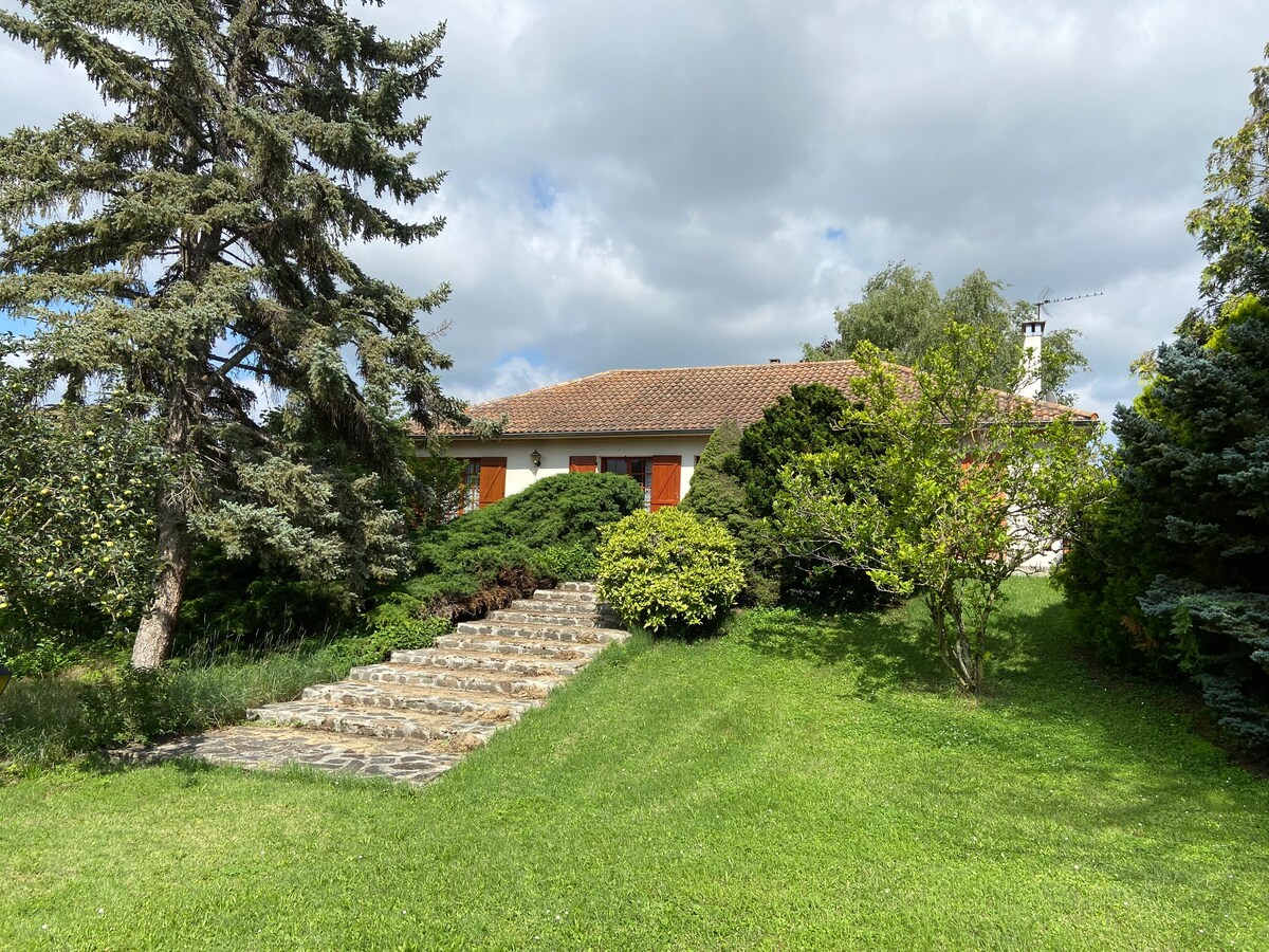 Kuthule, indlu ethokomele futhi evulekile yawo wonke umndeni: amakamelo okulala angu-3 phezulu: igumbi lokulala elingu-1 1 umbhede ongu-2 pers + i-TV + umbhede wosana, ikamelo elilodwa imibhede engu-2 + umbhede womgqomo, umbhede owodwa wegumbi lokulala elingu-2 pers +usinki, igumbi lokudlela lasekhishini elinendawo yokubasa umlilo , usofa + izihlalo zezandla, itafula langaphandle lethala, isambulela, i-BBQ, ama-sun lounger kanye nengadi evaliwe,okungeneka ngokuqondile efasiteleni lengilazi elishelelayo, indawo yokupaka ephrayivethi, indlela yokungena ezimele. I-Animal yamukelwe. Bhukha isayithi esayithini nasezincwajaneni .
