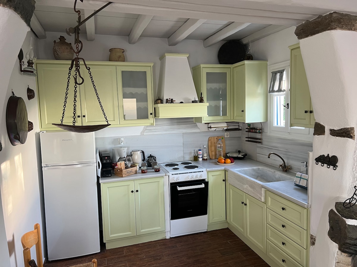 Indlu yakhiwa ngo-1887 edolobhaneni lase-Arnados elakhiwe ngendlela eyi-amphitheatre elibheke iziqhingi zase-Mykonos, i-Syros, i-Paros ne-Naxos. Indlu ingamamitha-skwele angu-70 yezivakashi ezingu-4 futhi yalungiswa ngo-2006 – 2008 kugcinwe zonke izici zobuciko bokwakha. Inamakamelo okulala amabili (elinye linombhede ophindwe kabili kanti elinye linemibhede emibili eyodwa), indlu yokugezela eneshawa, igumbi lokuphumula elinosofa wasekhoneni owakhiwe ngendlela yendabuko, indawo yomlilo, Ikhishi kanye ne-veranda Enkulu engamamitha-skwele angu-70 enokubukeka okuhle kweziqhingi ze-cyclades.
