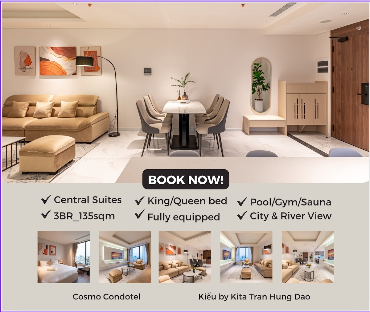 This LUXURY 3beds apartment 125sqm is located at Kieu by Kita Tran Hung Dao_super central in Ho Chi Minh * CENTRAL location, only 2km to Bến Thành market: * ELITE furniture, COMFORTABLE bedding, HIGH-END facilities * HIGH Level 18 * PANORAMIC View to Sai Gon River/City Skyline * AMAZING Infinity POOL * Yoga room/ Kid playground/Co-working space,.. * GYM with Panoramic D1 View * FREE Airport Pick_up for reservation from 7 nights * FREE CLEANING Every 4 days * FREE 6 Bottles water