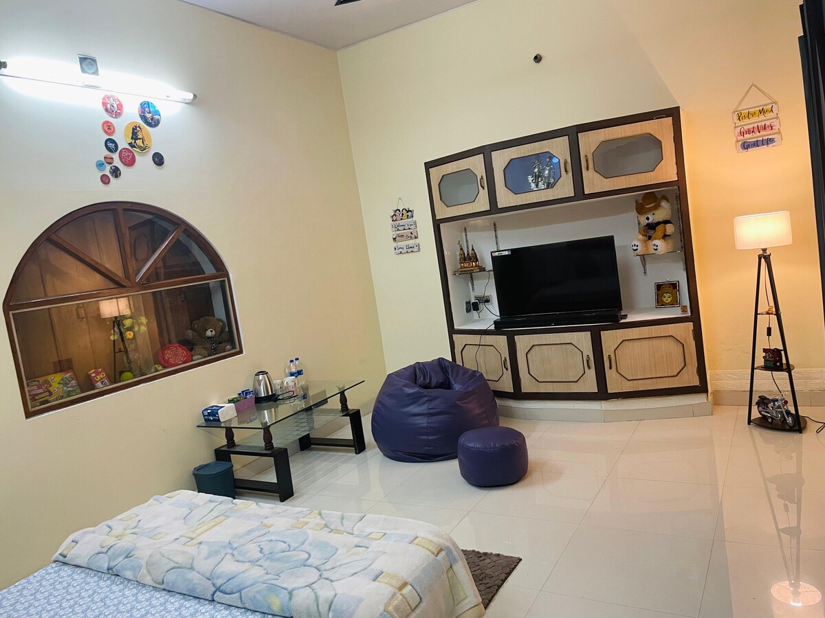 Phumula nawo wonke umndeni kule ndawo yokuhlala enokuthula. Iyunithi kanokusho enamakamelo okulala amathathu, indawo yokuhlala nekhishi elinazo zonke izinto ezidingekayo. Le ndlu isekoloni ukusuka emgwaqeni omkhulu oqhele ngamamitha angu-100, umgwaqo oya ekoloni unzima kodwa ngihlale ngitholakalela isivakashi sethu - Inesipholisa-moya esiphelele - Ikhishi elinakho konke eline-RO - I-WiFi yamahhala -amayunithi e-TV ekamelweni ngalinye lokulala - Ihlanzekile futhi Ihlanzeke Ngokuphelele - Indawo Yokupaka Yamahhala *Itekisi , i-Auto ne-E-Rickshaw kuyatholakala ocingweni.