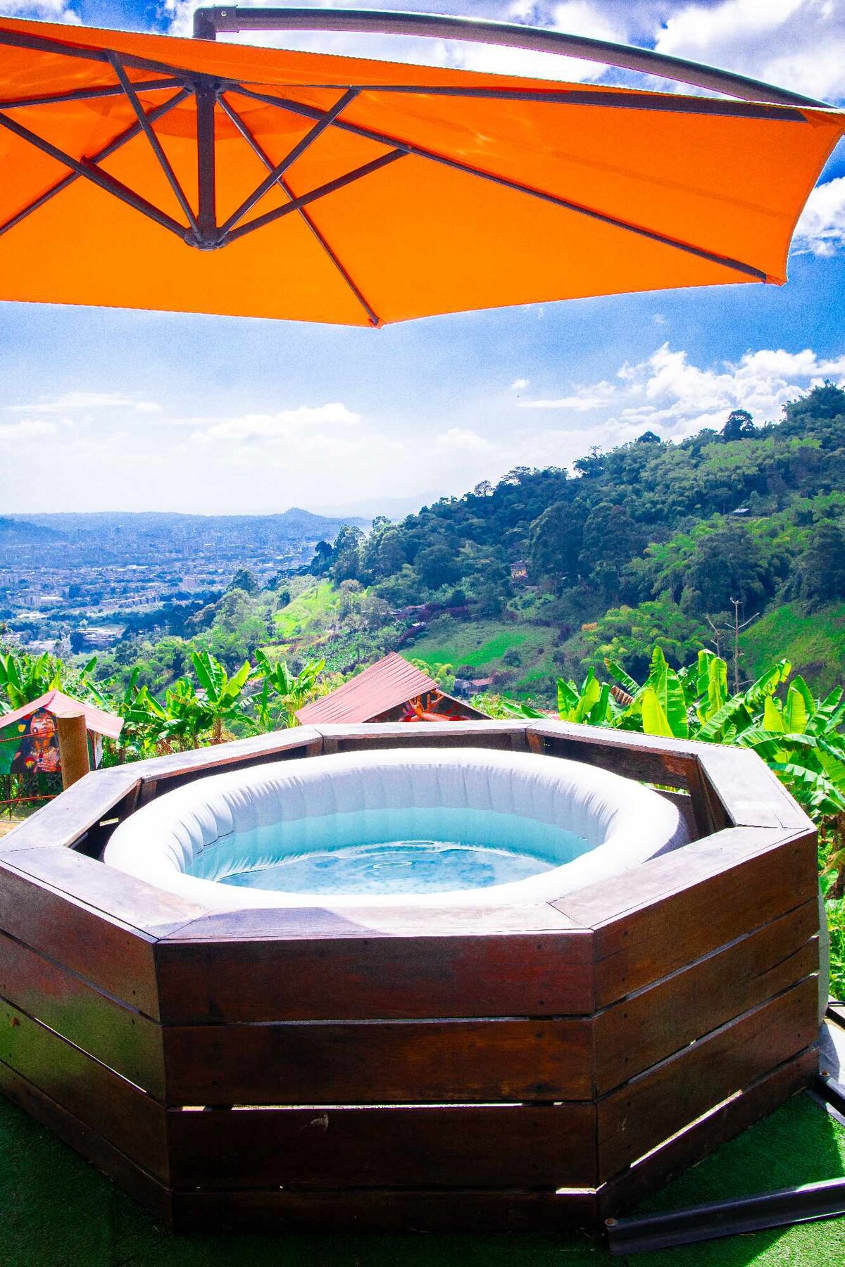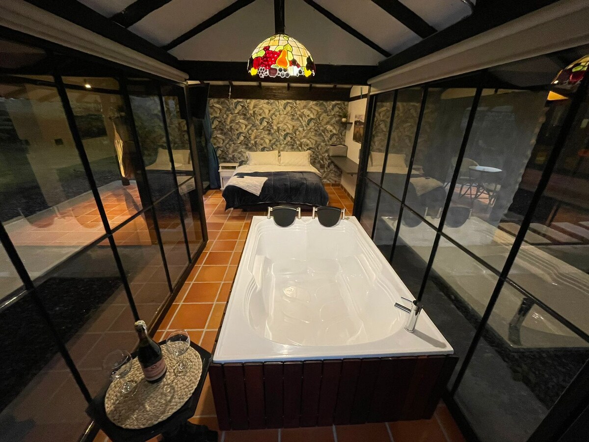 Nuestra cabaña para dos personas es el lugar perfecto para desconectar del ajetreo de la ciudad y conectar con la naturaleza. Ubicada en un entorno familiar, nuestra cabaña ofrece: - Cuarto con cama queen, con aire acondicionado, closet y TV pantalla plana. - Baño privado con agua caliente. - Cocina con barra americana. - Sala con chimenea eléctrica. - Terraza, Jacuzzi agua caliente y malla catamaran. - A 20 minutos del centro de la ciudad y a 5 minutos de restaurantes, supermercados etc.