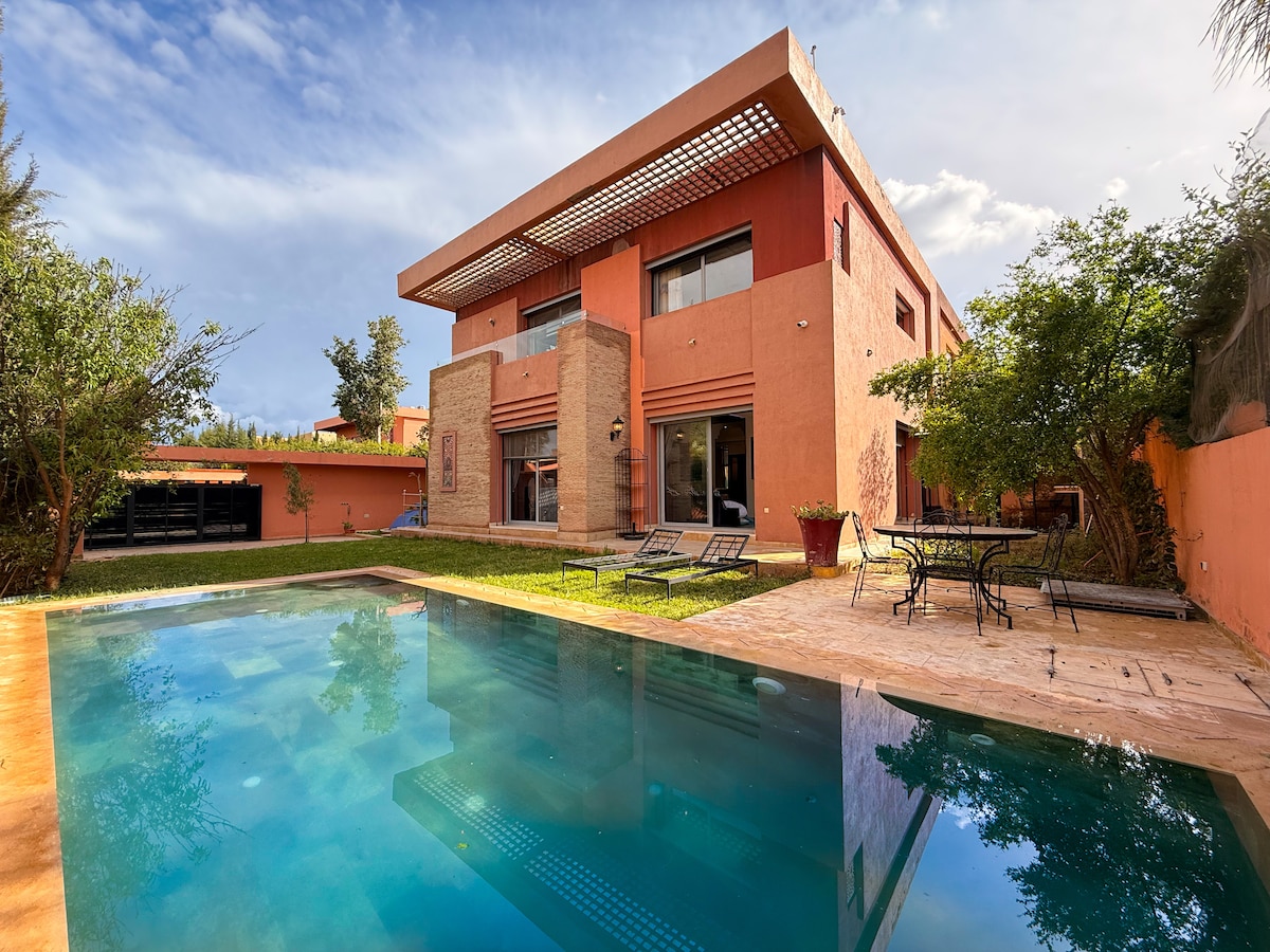 Ihlezi enkabeni ye-Royal Palm ehlonishwayo (km 12 Marrakech), i-villa yethu yangasese yokunethezeka inamakamelo amabili anamagumbi okugezela, indawo yokuphumula enkulu yasebusika, indawo yokuphumula yasehlobo, indawo yokubhukuda yangasese namakhishi angaphakathi nangaphandle ane-barbecue. Jabulela i-ping pong, amabhayisikili atholakalayo namasevisi anakayo avela e-Adil nase-Meryem. Ukuhlala okukhethekile, okuhlanganisa ukunethezeka, ukulungisa nokuzola.