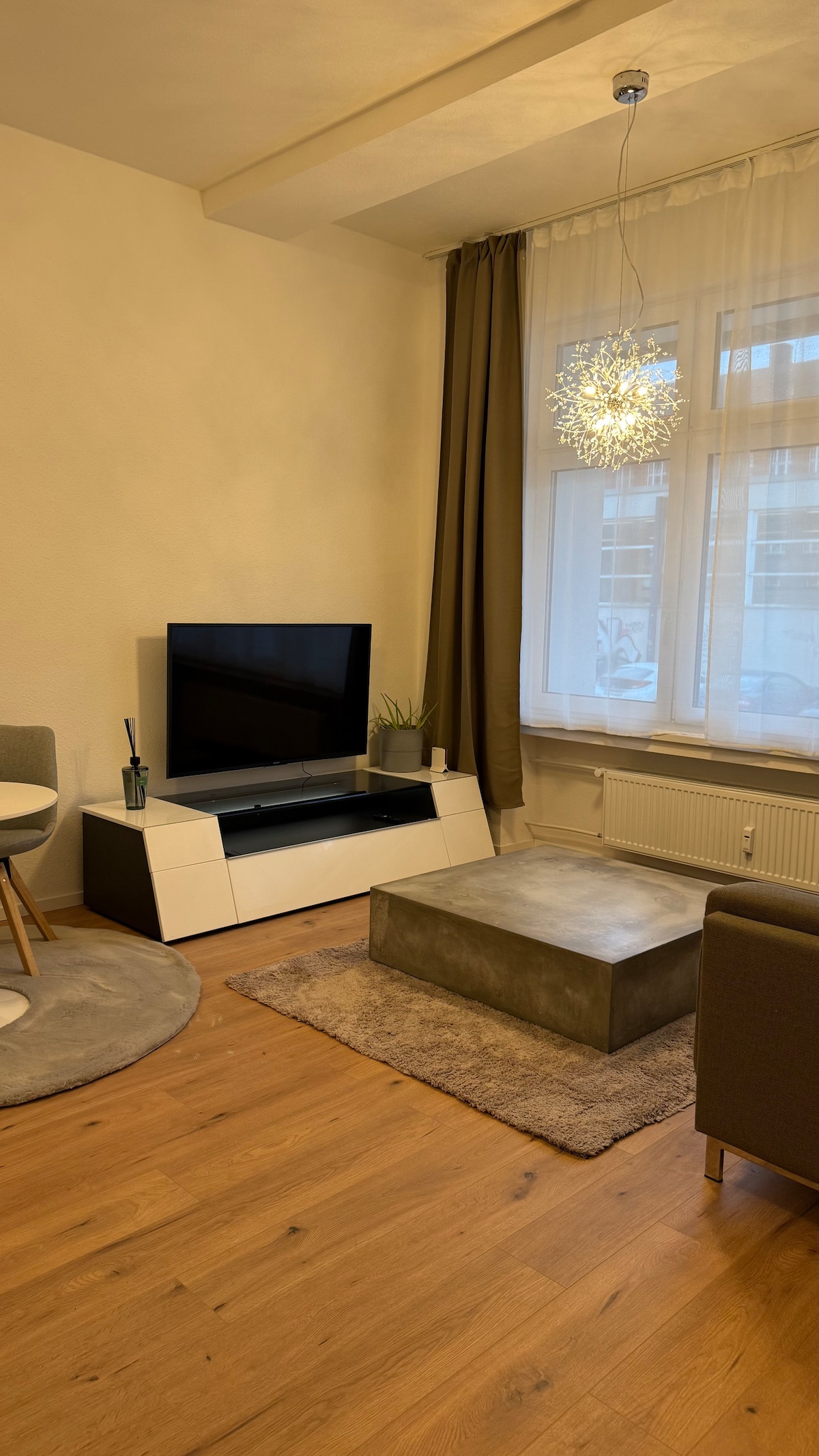 Ifulethi elikhanyayo, elinefenisha elimnandi nelithokomele esakhiweni esidala esihle kakhulu enkabeni ye-Duisburg ene-loggia nokubukwa kwendawo ephawulekayo yedolobha. Ifulethi lihlotshiswe phezulu futhi linikeza indawo emaphakathi kakhulu edolobheni lase-Duisburg eduze ne-Dellplatz ethandwayo enama-pub amaningi namakhefi. Zonke izindawo ezinkulu zokuthenga ngaphakathi kwebanga lokuhamba ngezinyawo, umthengisi ophambene, ibhikawozi endlini, izitolo ezinkulu 300 m, i-metro stop 30 m, isiteshi esiphakathi 15 min walk noma 2 metro stop.