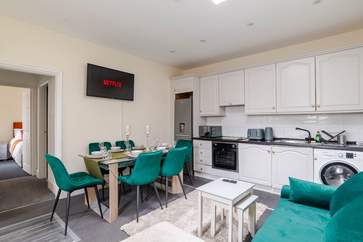 Indawo ekahle yazo zonke izinto e-London! Indawo yokupaka, uhambo olufushane oluya endaweni engaphansi komhlaba (Tube) namabhasi amaningi aseduze. Indawo eningi yezivakashi ezingu-4, igumbi lokuphumula eline-Smart TV enamashaneli amaningi. Ikhishi elinakho konke okudingayo ekudleni okuphekwe ekhaya Indlu yokugezela yesimanje enobhavu/ishawa nesibuko esikhulu esikhanyayo namasevisi. Ikamelo lokulala eliyinhloko linombhede omkhulu, futhi ikamelo lesibili linombhede olala abantu ababili. Omatilasi abanethezekile. Ukufinyelela engadini yangasese enetafula nezihlalo.