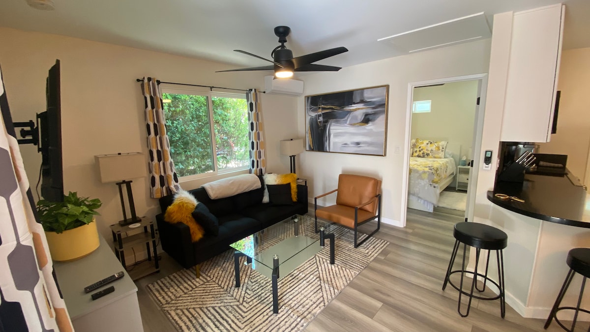 Yonga ekuhlaleni kwakho e-BohoHouseSB. Uyemukelwa e-Boho Bungalow! Indawo yokuphumula eyimfihlo esengadini eluhlaza. Le ndlu yezivakashi engu-500 SF ehlelwe kahle enegceke elibiyelwe, izinto ezibalulekile ezitholakalayo, ikhishi, umatilasi we-king Beautyrest, i-Apple TV, i-WIFI nombhede wosofa onokufinyelela okuhlanganyelwayo endaweni yengadi yomphakathi enobhavu lweqhwa, i-sauna, indawo yokuphumula yetiye, izihlalo, ishawa yangaphandle nemigodi yomlilo. Jabulela ukungena kumuntu owelapha ngamakhambi, izinsimbi, izinkukhu, nemicimbi esendaweni. Eduze nedolobha, amabhishi, i-UCSB ne-SB Bowl. izinja zivunyelwe.