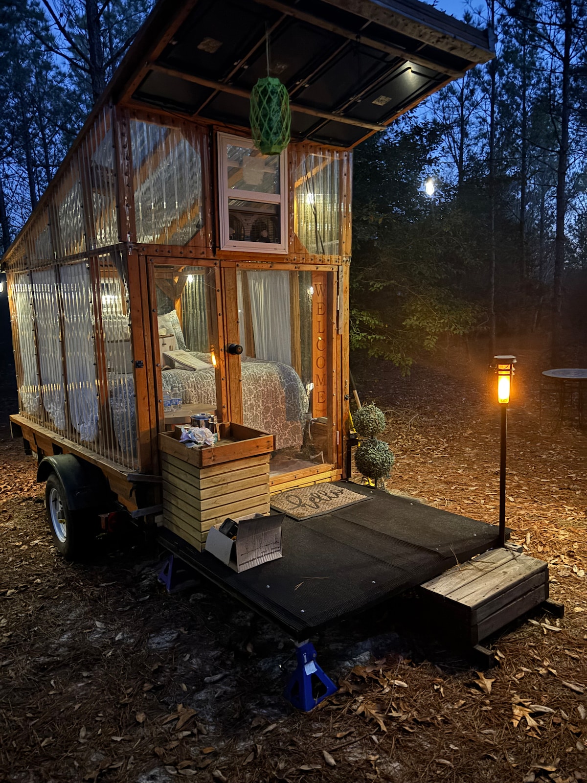 Tucked in the woods, this property offers a comfy bed in a tiny “home.” If you love to camp but don’t particularly care to worry with setting up a tent and all that goes with it, this is the place for you! Enjoy the lovely setting of this romantic spot in nature. Short walk to 20 acre lake where you can kayak, fish, or paddleboat.