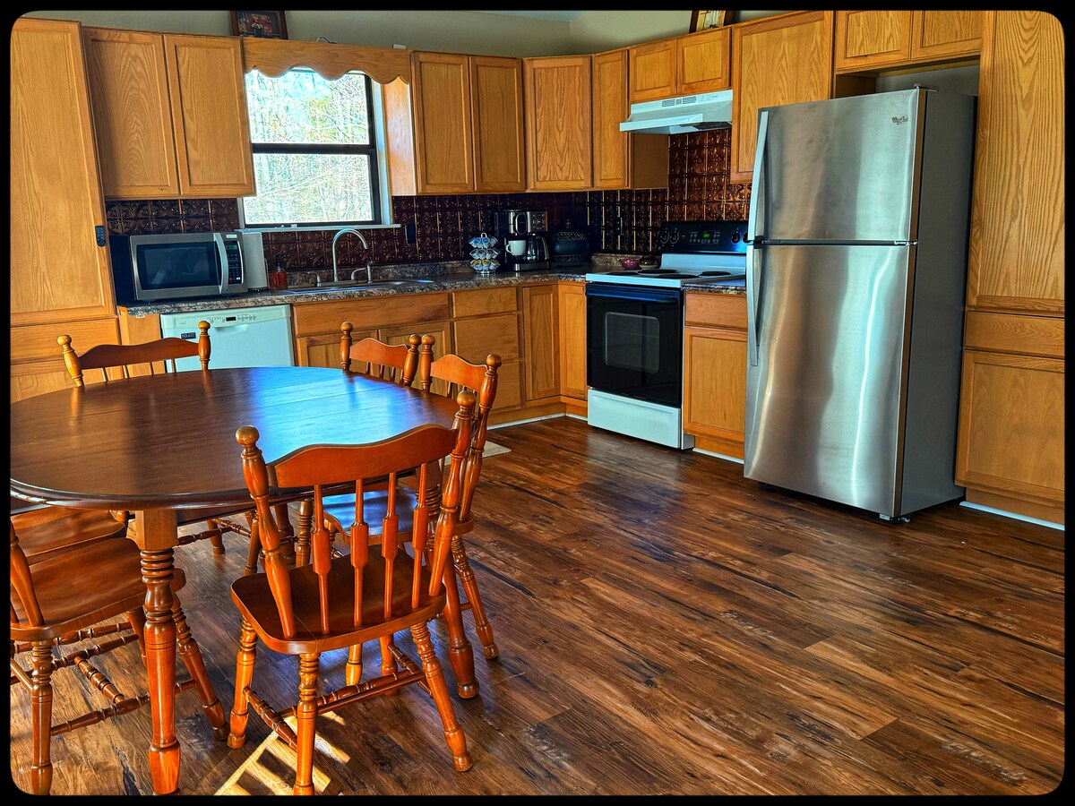 Indlu yezivakashi enokuthula engaselwandle, enephegola, ama-swing abantu abadala ayi-octagon nendawo yokuphumula eyimfihlo. Epulazini elincane elinezinkukhu namaqanda amasha. Igumbi lokuphumula lineziko elithokomele elinezihlalo ezithambile ezisebenza ngogesi. Indlu yethu yezivakashi enekamelo elilodwa lokulala inombhede owesifazane oyisikulu ekamelweni lokulala. Kunemibhede emibili yezinsana noma umatilasi omkhulu wabantu abangu-2. Kukhona umshini wokuwasha/wokomisa, uvulande one-grill, ikhishi eligcwele, elinakho konke okudingayo ukuze upheke okuhlanganisa i-air fryer, i-microwave, ne-crock pot!! Buza ngezaphulelo! Woza ujabulele izwe!