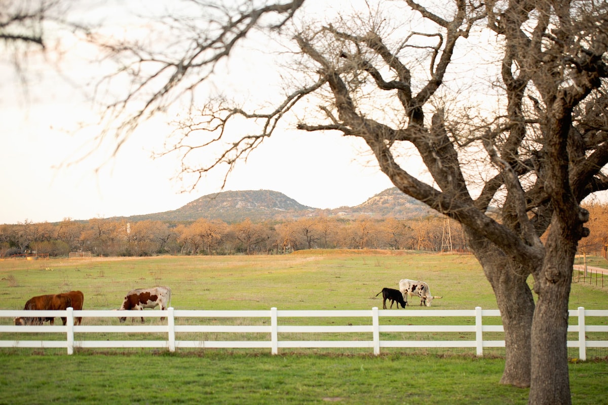 Siyakwamukela ku-Twisted Oak. Ngeke ufune ukushiya le ndlu enhle, eyingqayizivele, enokuthula yase-Texas. Jabulela isibhakabhaka sasebusuku esigcwele izinkanyezi ngenkathi ungena kubhavu wamanzi ashisayo wangasese! I-DEER, i-turkey, neyangempela yamahhala i-Texas Longhorns izulazula indawo evulekile. Woza isilwane emakhabetheni amahhashi! Gcwalisa ngombhede othokomele, ikhishi elincane, negumbi lokugezela elikhulu. Uhambo oluhle kakhulu oluya e-FBG. Le ndlu eyakhiwe ngamapulangwe, ecwengisisiwe ikunikeza ukunambitheka kwesibhedlela se-Hill Country. Indawo yokuvakasha 💕 Phumula futhi ubuke IMPUNGUSHE!