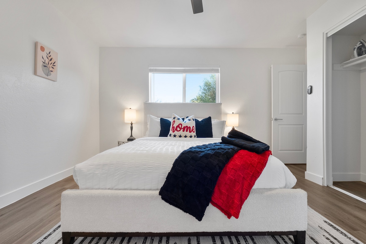 ✨ I-2BR/2BA Scottsdale Getaway ENTSHA SHA | Eduze Nemizila Nedolobha Elidala Jabulela ukuhlala ogwadule eduze ne-Papago Park, i-Old Town, i-Desert Botanical Garden, ne-Camelback Mountain. Jabulela ikhishi lompheki, ifriji lewayini, amakhabethe okungena, uvulande wangasese, nezindlu zokugezela zikanokusho. ✔ I-Resort Pool, i-Rooftop Lounge & Clubroom ✔ 24-Hr Gym & Package Concierge ✔ I-Smart Tech + Fast Wi-Fi ✔ Ilungele Izilwane Ezifuywayo + Indawo Yokupaka Yamahhala Indawo yakho ekahle kakhulu yasogwadule ikulindile!!