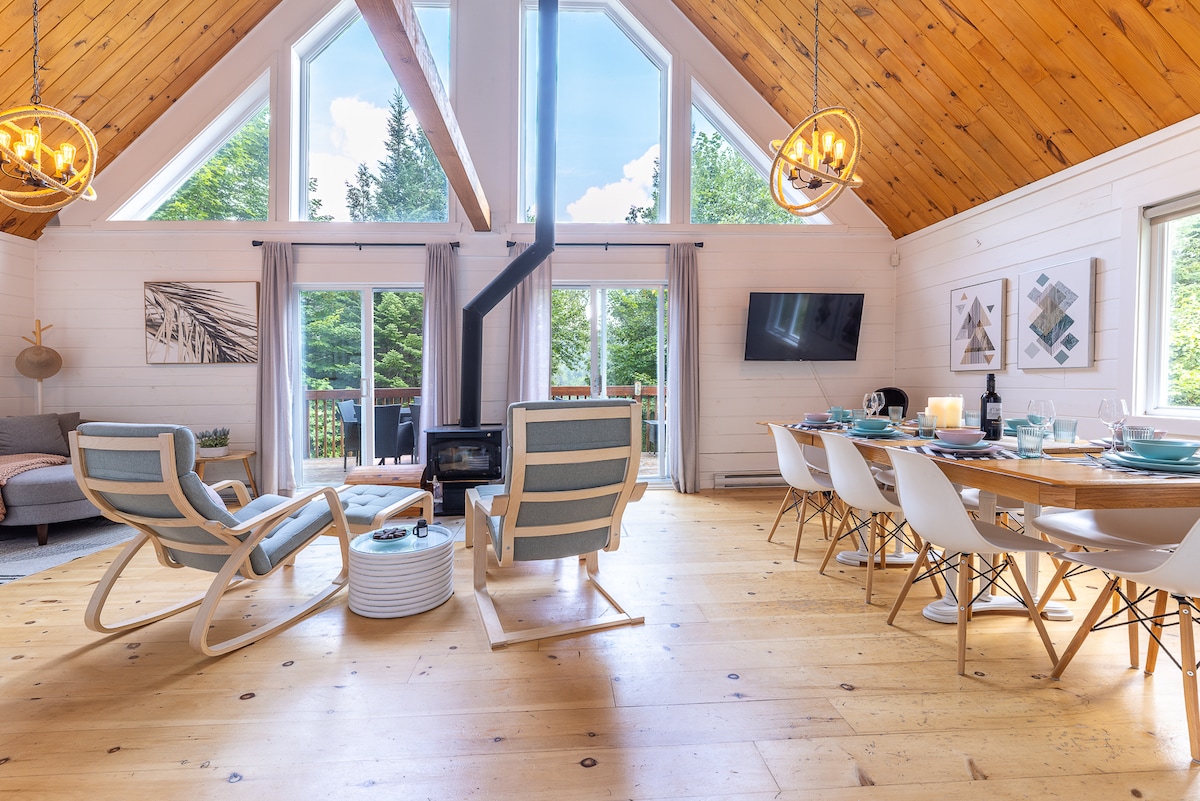 Profitez de l'effet apaisant de la nature en séjournant dans ce chalet contemporain à fenestration abondante en plein coeur de la forêt. Tremblant est magnifique, peu importe la saison. Destination plein air de rêve, vous serez à 8 minutes du Mont-Blanc et 20 minutes du Mont Tremblant. Que ce soit pour la randonnée, le ski de fonds, la raquette ou la motoneige, des sentiers sont accessibles facilement dans toutes les directions. Sans oublier le célèbre P'tit Train du Nord à 3 minutes de route.