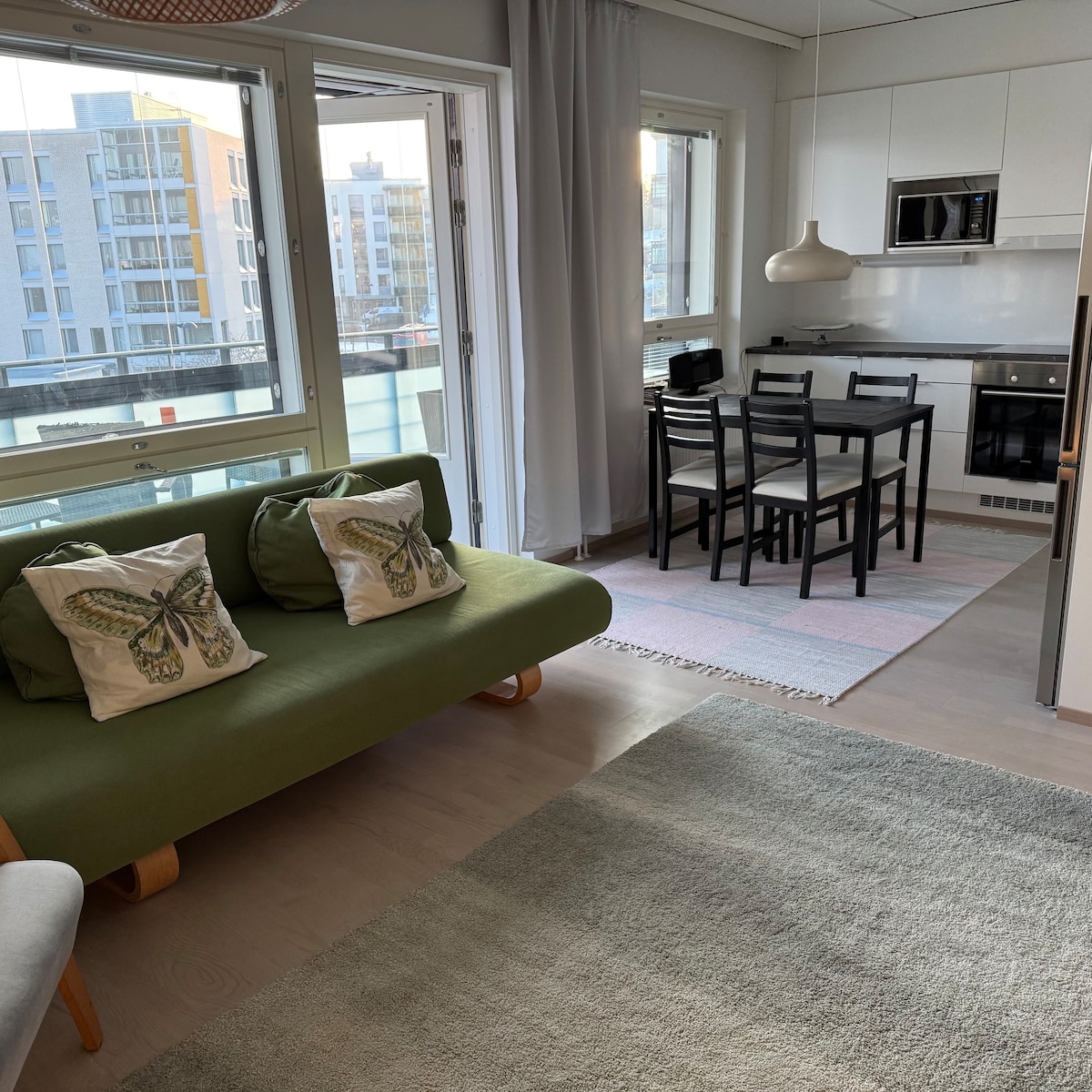 Ifulethi lesimanje elinendawo yokushaya umoya elingu-43,5 sqm esakhiweni esiyisakhiwo esiphakeme esiseduze nesiteshi se-metro i-Matinkylä nesitolo esikhulu se-Iso Omena (isitolo esikhulu sonyaka sika-2018 NCSC). Ukubuka okuhle kakhulu kwesitezi se-16 (isitezi sokuhlala se-14) kusuka kuvulande omkhulu ogcwele ingilazi onendawo yokuhlala. Isikhungo sedolobha lase-Helsinki siqhele ngemizuzu engu-20 kuphela uma uhamba ngesitimela. Ikamelo elilodwa elinombhede omkhulu (ongamamitha angu-180 ububanzi) kanye nesofa eliyimodula egumbini lokuphumula elinemibhede engu-3 ehlukene engamamitha angu-80x200 enendlela evuleka kalula.