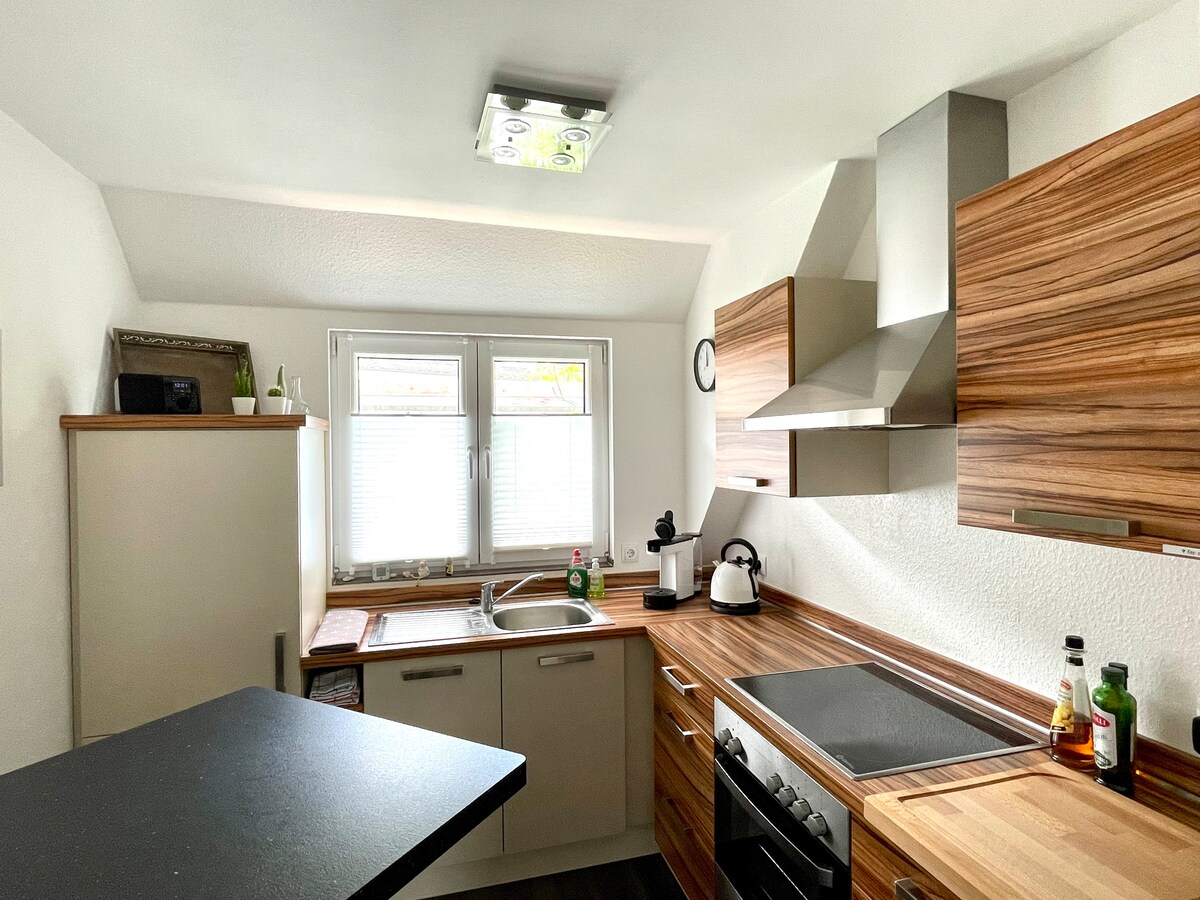 Ifulethi elingu-82 sqm elinendawo yokungena ehlukile liyingxenye ye-bungalow yethu yesitayela se-Bauhaus. Indlu isemaphandleni, ithule kakhulu, iqhele ngamakhilomitha angu-7 ukusuka e-Nürburgring. Bobabili abathandi bomjaho nabagibeli bezintaba nabagibeli bamabhayisikili bazothola indawo ekahle lapha. Umzila wamaphupho, i-Hohe Acht, i-Laacher See ne-Maare e-Volcanic Eifel. Ifulethi lingahlalisa abantu abangu-5 (umbhede owodwa, umbhede owodwa ongamawele nombhede owodwa wokukhipha) futhi linegumbi lokudlela, ikhishi, igumbi lokugezela (ishawa, ubhavu), indlu yangasese yesivakashi, ithala langasese.