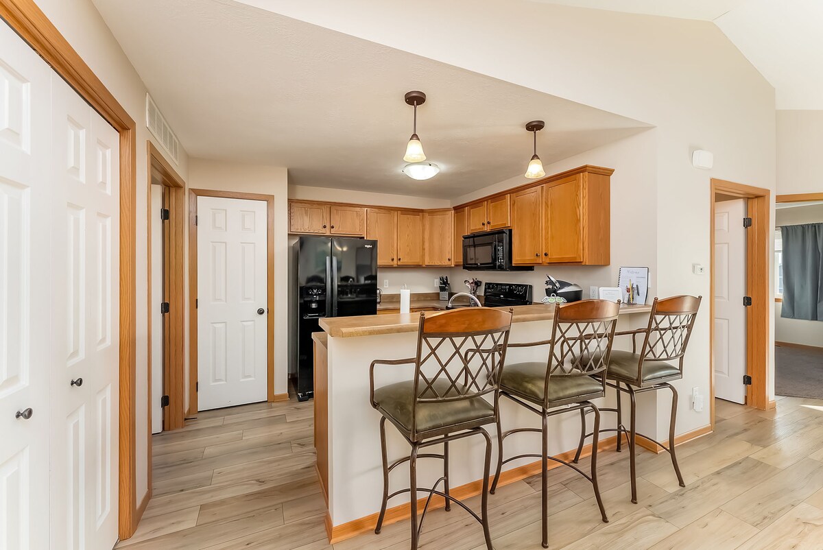 Siyakwamukela endaweni yakho yokuzipholela yase-Southside! Le ranch engamamitha skwele angu-1,488 inikeza ukunethezeka nokuphatheka kalula ngamagumbi okulala angu-2 anemibhede emikhulu, amagumbi okugezela angu-2, kanye nesuithi yebhizinisi enombhede ophindwe kabili ne-Wi-Fi. Jabulela igumbi lokuphumula elithokomele eline-TV engu-65”, igceke elibiyelwe, uvulande, negalaji elinezitebele ezimbili. Izinja ziyamukelwa (okungenani ezingu-2; bheka imithetho ngaphansi kokuthi "Eminye Imininingwane Okufanele Uyazi"). Kulala abangu-5 ubuningi — isivakashi sesi-5 +$50/ubusuku. Ilungele imindeni, ochwepheshe, nezihambi ezifuna ukuphumula okuthulile eduze kwezindawo ezikhangayo zaseSioux Falls.