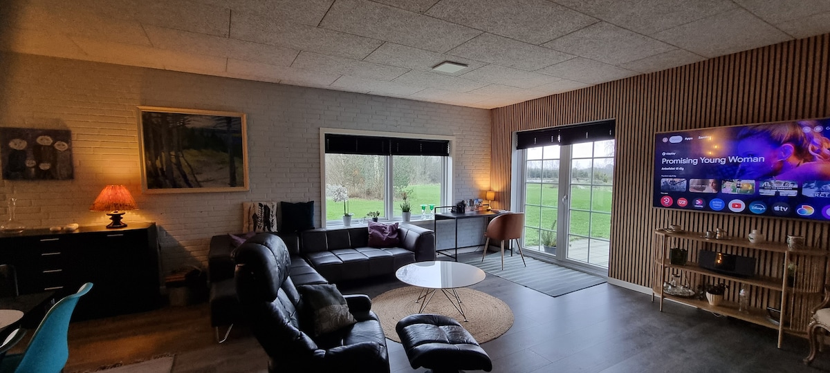 Indlu yethu eyakhiwe ngamapulangwe iyindawo yokuba khona, yokuphumula kanye "ne-hygge", ehlotshiswe ngezinto ezihlukile, esizitholile kuyo yonke i-Denmark. Amafasitela amakhulu endlini eyakhiwe ngamapulangwe akwenza ufune ukuhlala futhi ubheke imvelo, evakashelwa njalo yizimuncu, ama-ralidayits nama-pheasants. Indlu ingaphandle kwedolobha i-Nordby endaweni ephrayivethi. Ngakolunye uhlangothi ungabona amahhashi futhi ngakolunye uhlangothi unethala langasese eliseningizimu-mpumalanga. Sithemba ukuthi uzokujabulela ukuhlala kwakho🌱