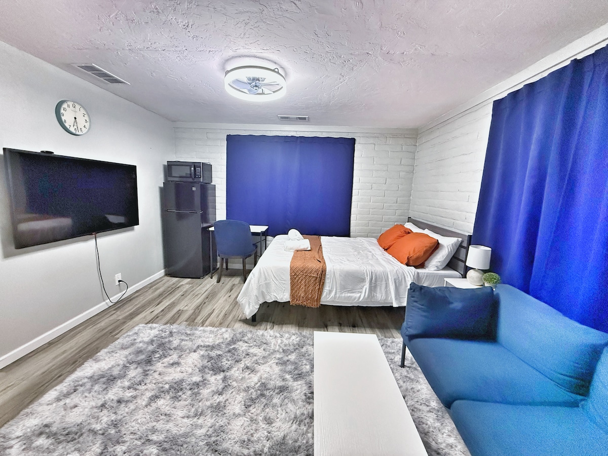 Jabulela okokuzithokozisa okuyisitayela kule ndawo ephakathi nendawo. Isakhiwo sisakhiwo esisha futhi sithuthukise amasevisi. Igumbi lokugezela linekhabethe lemithi engenalutho elishisayo. Isipikha se-Bluetooth egumbini lokugezela esinesethingi yokukhanya/yasebusuku. Vele ulethe ibhrashi yamazinyo. Amachweba e-USB ne-USB-C atholakala eceleni kombhede nangaphansi kwebha. Izibani ezifiphekayo kuyo yonke indlu. I-LG Washer/Dryer inesilinganiso esiphelele. Isakhiwo sivunyelwe futhi sihlolwe yidolobha Ngokuphepha.