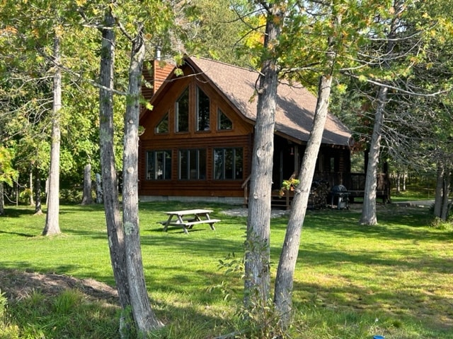 Indlu yami eyakhiwe ngamapulangwe engasechibini isechibini eliphrayivethi elingenayo indawo yomphakathi (Sicela uphawule, anginaso isikebhe sokuba izivakashi zize nezikebhe zazo ngenxa yegquma eliminyene). Iseduze nemizila eminingi ye-snowmobile/ATV, amachibi amaningi amahle, kanye ne-Chippewa National Forest. Kunamamitha angu-250 ogwini namahektare angaphezu kuka-30 omhlaba wokuzingela ngaphesheya kwe-County Road 65. Indlu eyakhiwe ngamapulangwe ingamahektare angaphezu kuka-4; inendawo enkulu yokungcebeleka. Kunendlu yesikebhe, idokodo, ama-kayak amabili, isikebhe esincane nemoto, umgodi womlilo nendawo yokosa igesi.