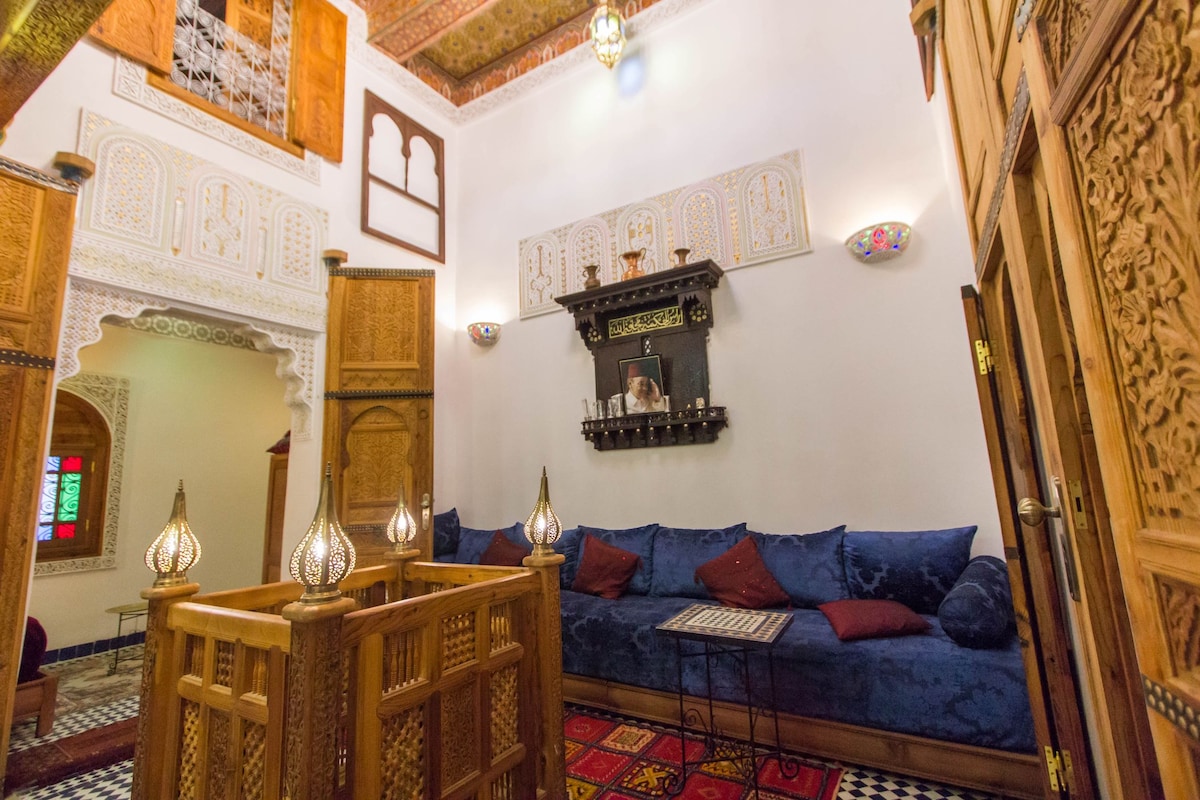 Enkabeni ye-medina yakudala ye-Fès, le ndlu yendabuko inikeza uvulande ogcwele izitshalo nezimbali, ithala elisophahleni eline-barbecue, nezindawo ezithokomele ezinamaragi enziwe ngezandla. Ihlanganisa i-salon, amakamelo amabili ane-air conditioning ne-heater, amanzi ashisayo kuyo yonke indawo, nekhishi eligcwele. Umtapo omncane uxoxa ngezindaba zesiko lase-Morocco. Ukungena ngezitebhisi ezingu-25, okuholela endaweni ezolile nephakeme eduze nemithombo yamanzi engokomlando yedolobha.