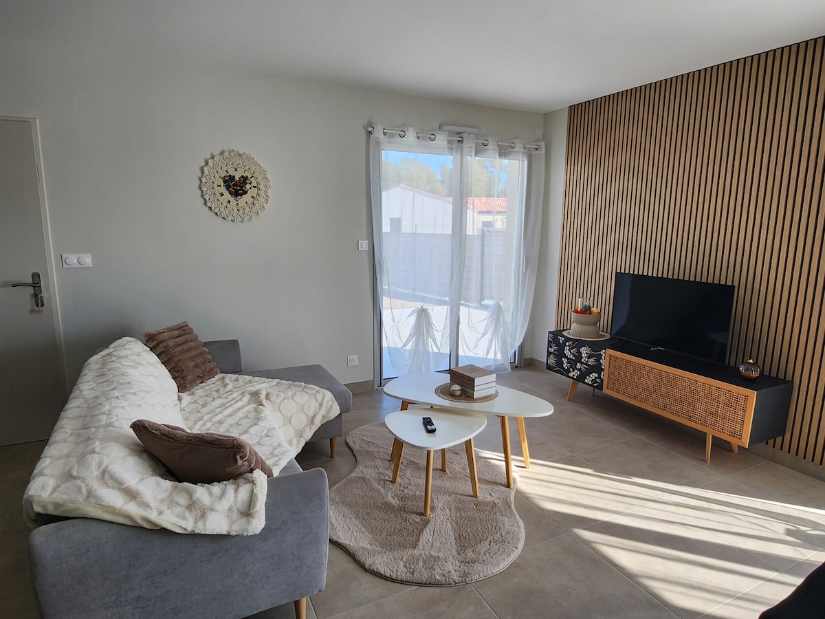 Maison neuve T2, avec jardin privatif et entièrement clos, au calme d'une impasse. Stationnement privé et gratuit devant le logement. Equipée de salon de jardin, transat, barbecue gaz. L'intérieur du logement offre un salon séjour sur baie vitrée avec Smart TV, wi fi, une cuisine équipée, une chambre avec lit 160 X 200 matelas Eve à mémoire de forme, dressing. Accès à une vaste salle d'eau, wc et douche hydro massante. Proximité de toute commodités et du centre ville. Vélos sur demande.