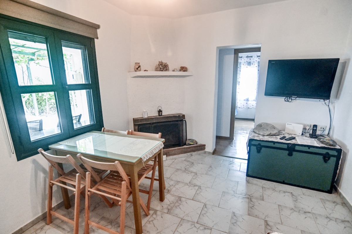 Das traditionelle Steinhaus grenzt an einer Seite an die natürliche Felswand. Das Bad ist ganz in den Fels hinein gebaut. Das ergibt ein ganz spektakuläres Wohngefühl und den Eindruck, mitten in der Natur zu sein. Die Terrasse hat eine wunderschöne Aussicht auf das Meer, den Strand von Fytema und die Berge von Messaria. Die Wohnung ist 2023 mit ökologischen Materialien im traditionellen Stil ausgebaut worden. Zum Strand sind es nur 200 m.