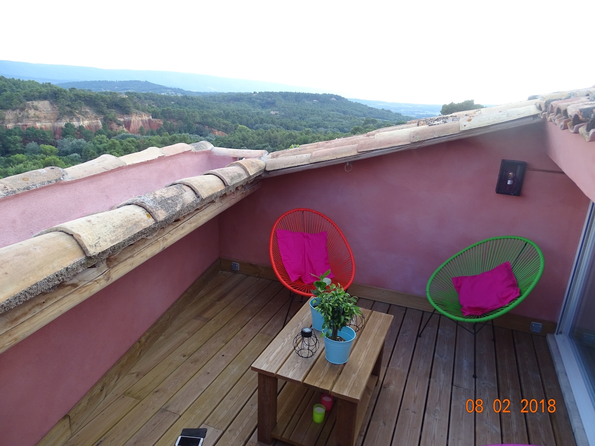 I-Roussillon iyidolobhana elivamise ukuba yiProvencal enhliziyweni yeLuberon Park futhi iyingxenye yenhlangano yamadolobhana amahle kakhulu eFrance. Ilungiswe ngokuphelele ngo-2018, indlu isezingeni eli-2 futhi imaphakathi nedolobhana, emgwaqweni othule kakhulu. Enye yezimpahla zayo eziyinhloko ithala layo elibheke eningizimu elinombono walo we-panoramic we-Ocres cliffs yase-Roussillon, i-Luberon massif kanye nobubanzi be-Alpilles. Ifakwe konke ukunethezeka okudingekayo ngesikhathi sokuhlala kwakho.