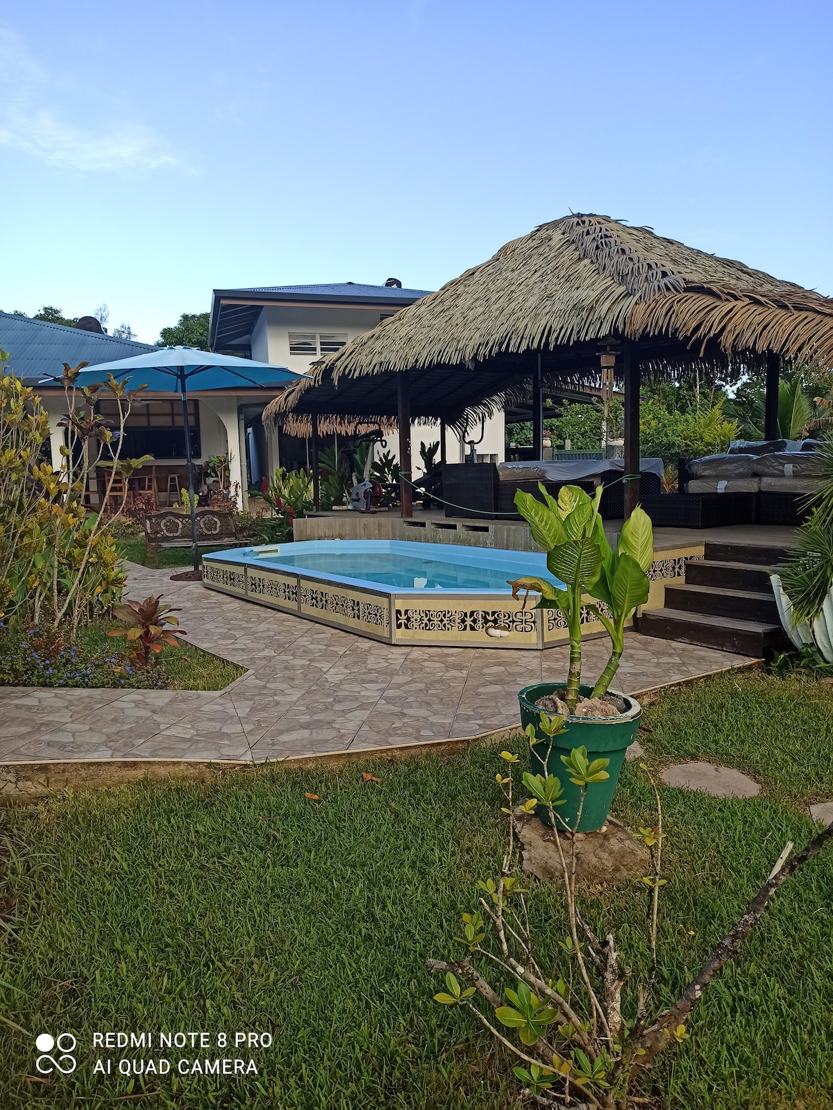 Uvela kude, uvakashela isiqhingi esingcwele sase-Raiatea, Siyakwamukela e- indlu ETHOKOMELE, entsha, yesimanje, ENEKAMELO elingu-100 m2 negumbi lokuhlala, ikhishi, ibha evuliwe ngama-blinds e-roller ENDLINI enhle ENOKUTHULA, ukubuka iNtaba i-Temehani nengadi eyenziwe ngamapulangwe ukuphosa itshe kusuka ku-lagoon. Indawo yokubhukuda ye-Spa ene-solarium yayo kanye ne-pote yemali (indlu encane yonke ivulekile endaweni).