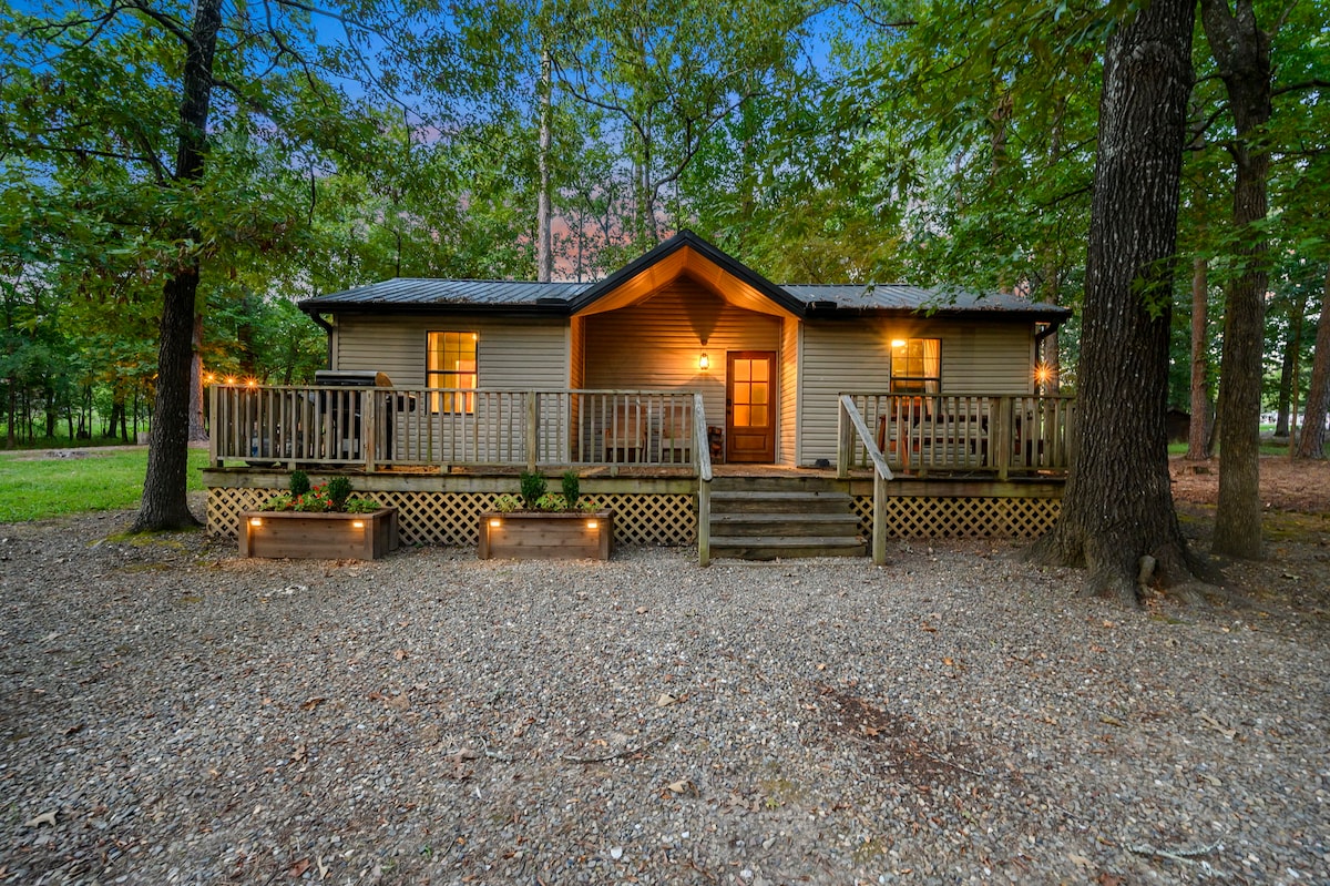 Indlu eyakhiwe ngamapulangwe eyodwa noma imibhangqwana eyodwa, ihlezi kuma-acre angu-3 phezu kwechibi elincane (ayikho inhlanzi) ezungezwe izihlahla nezilwane zasendle. Kutholakala ku-5 mi. ukusuka ku-Broken Bow, no-13 mi. ukusuka e-Hochatown. Kuyinto emfushane yemizuzu engu-20 ngemoto ukusuka eBeavers Bend State Park, imizuzu engu-10 ukusuka eNtabeni Fork River kanye nemizuzu engu-6 ukusuka e-Glover River kanye nemizuzu engu-35 ukusuka e-Pine Creek. Ubumfihlo obuningi, ithrafikhi encane, ukufinyelela okusheshayo nokulula kuzo zonke izindawo eziseduzane kanye nawo wonke amasevisi okuhlala okuthula okunethezekile.
