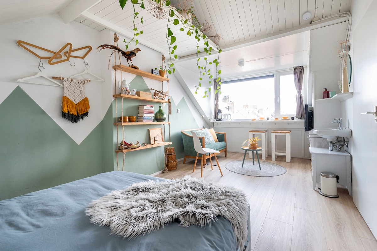 Indlwana encane yamapulangwe eluhlaza okwesibhakabhaka enendawo yayo yokungena ne-veranda, esenkabeni ye-Geldrop (eduze ne-Eindhoven). Ungajabulela lapha ngephrayivesi ephelele, uhlole indawo uhamba ngezinyawo (okuhlanganisa i-Strabrechtse Heide) futhi ujabulele ukwamukela izivakashi okuthokomele kwe-Burgundian Brabant. I-Geldrop inesikhungo esihle ngokumangazayo esigcwele izitolo nezindawo zokudlela. Kunekamelo elihlukile nombhede egunjini lokuphumula, i-Wi-Fi, i-air conditioning, ifriji, itiye, ikhofi, i-TV, i-Netflix, usofa, itafula nesidlo sasekuseni! Okumnandi ukuthi, uwukuphela kwesivakashi sethu!