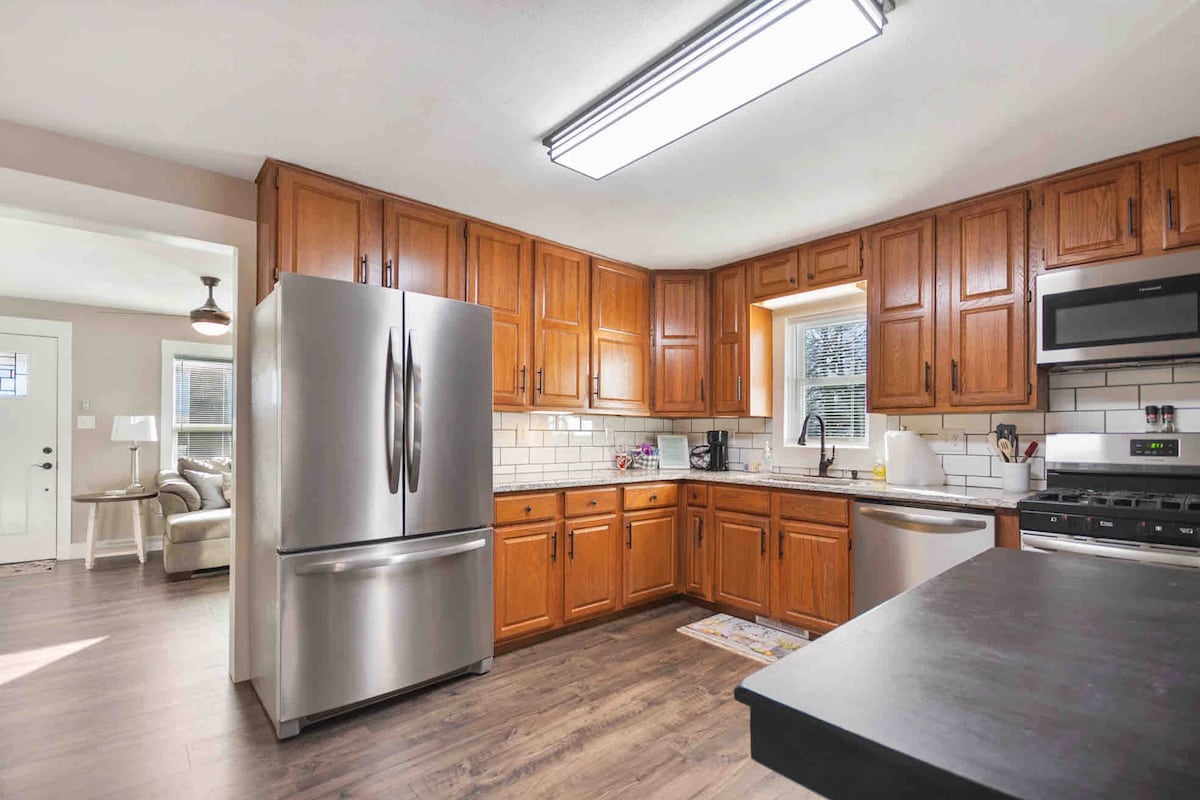 Jabulela indawo yethu ethokomele elungiswe ngokugcwele, amakamelo amane, ikhaya lokugeza elibili elinendawo enkulu yomndeni nabangane. Itholakala ngebanga lokuhamba ngezinyawo kuyo yonke indawo yokuthenga, izindawo zokudlela, amabhikawozi, izitolo ze-ayisikhilimu, nama-tavern. Ukufinyelela okulula futhi okulula emizileni yokuhamba namapaki. I-pack n play nomatilasi womoya nakho kunikeziwe. Ngaphansi kwemayela ukuya ku-Brick Ballroom! Futhi nje imoto emfushane eya e-Cherokee Casino nasekhampasini ye-JBU, kanye nemizuzu engu-30 yokushayela ukuya esikhumulweni sezindiza se-XNA!