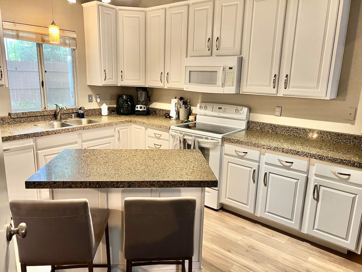 Ikhaya le-3bd 2bath, ikhishi elihle kodwa ukupheka kwangempela kuzokwenziwa kakhulu endaweni engemuva. Ukubhema kukagesi kwangaphandle, igridi enkulu yegesi yemvelo engu-3, i-BBQ enkulu yegesi yemvelo, ifriji lewayini, usinki wangaphandle, nesiqandisi sosayizi ogcwele, i-spa enkulu ngaphandle kwenkosi ne-couse ibha yangaphandle emboziwe kanye nendawo yomlilo emangalisayo, w/TV ngaphandle. Lokhu kulungele umndeni ovakashela umfundi we-csu noma ukuvakasha komndeni! Leli khaya lakhiwe ukuze lijabulise konke okudingayo NOKUNYE! Imayela elilodwa ukuya edolobheni.