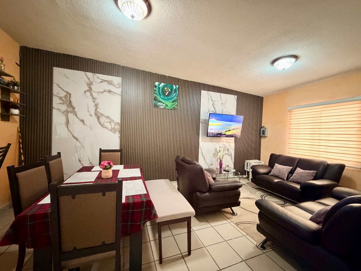 Ifulethi elihle kakhulu, linefenisha futhi lisendaweni ephakathi nendawo. Kukhanya futhi kunesitayela. Ifaka: Amakamelo okulala angu-2 Umbhede olala abantu ababili owodwa Imibhede engu-2 elala umuntu oyedwa Amagumbi okugeza angu-1 nohhafu Igumbi lokudlela Uvulande wokuzijabulisa one-barbecue Indawo yokusebenzela Ukuhlukaniswa okuncane endaweni ngayinye yayo Ikhishi Eliphelele Isevisi ye-TV ne-WiFi enejubane eliphezulu yehhovisi lasekhaya lomsebenzi I-Netflix I-Roku TV Amabhulokhi amabili ukusuka emgwaqweni omkhulu e-Gómez Palacio lapho kunezikhungo zezitolo, izindawo zokudlela nezinkantini Umtholampilo we-IMSS uqhele ngemizuzu engu-5 #46