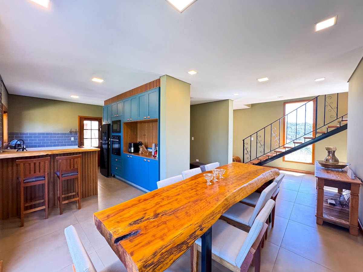 Woza ujabulele lokhu kokuzithokozisa okuyingqayizivele! Indlu eyakhiwe ngamapulangwe ecezile emvelweni futhi enombono ohlaba umxhwele kakhulu we-Pedra do Baú edumile. Konke lokhu ngaphakathi kwendlu yethu eyakhiwe ngamapulangwe enhle ngefomethi ye-A-Frame ese-Gonçalves, eningizimu ye-Minas Gerais. Iqhugwane elixuba, ngezinga elifanele, izakhiwo ezinesibindi nobuhle nokuphila kwasemaphandleni ngaphandle kokulahlekelwa yisimanje nobuciko bedolobha. Kuhle ukuba imibhangqwana enogqozi ijabulele okokuzithokozisa okuyingqayizivele kwezinzwa.
