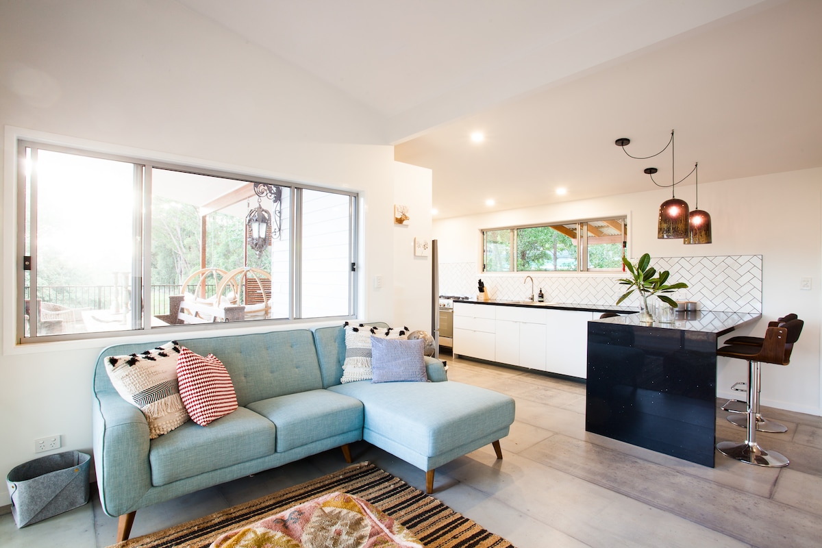 Ukuphefumula ukubukwa okukude kwezinga elingu-270 ukusuka ekuphumeni kwelanga kuya ekushoneni kwelanga. I-villa esanda kwakhiwa, ene-eco, epulazini lezinkomo elisebenzayo, elinikeza ama-vistas amangalisayo e-Byron Bay Hinterland ukusuka embhedeni wakho! Izindonga zemvelo zekalika, imiqadi yezinkuni ezisemaphandleni, nezindawo zaphansi zamapulangwe. Vula uhlelo ngengilazi esuka phansi. Iminyango yase-France ekamelweni lokulala ivulekile kubhavu wezinyawo emphemeni. Ibanga lokushayela elilula ukusuka e-Mullumbimby, e-Byron Bay, e-Brunswick Heads, isikhumulo sezindiza sase-Ballina kanye ne-Coolangatta / Gold Coast.
