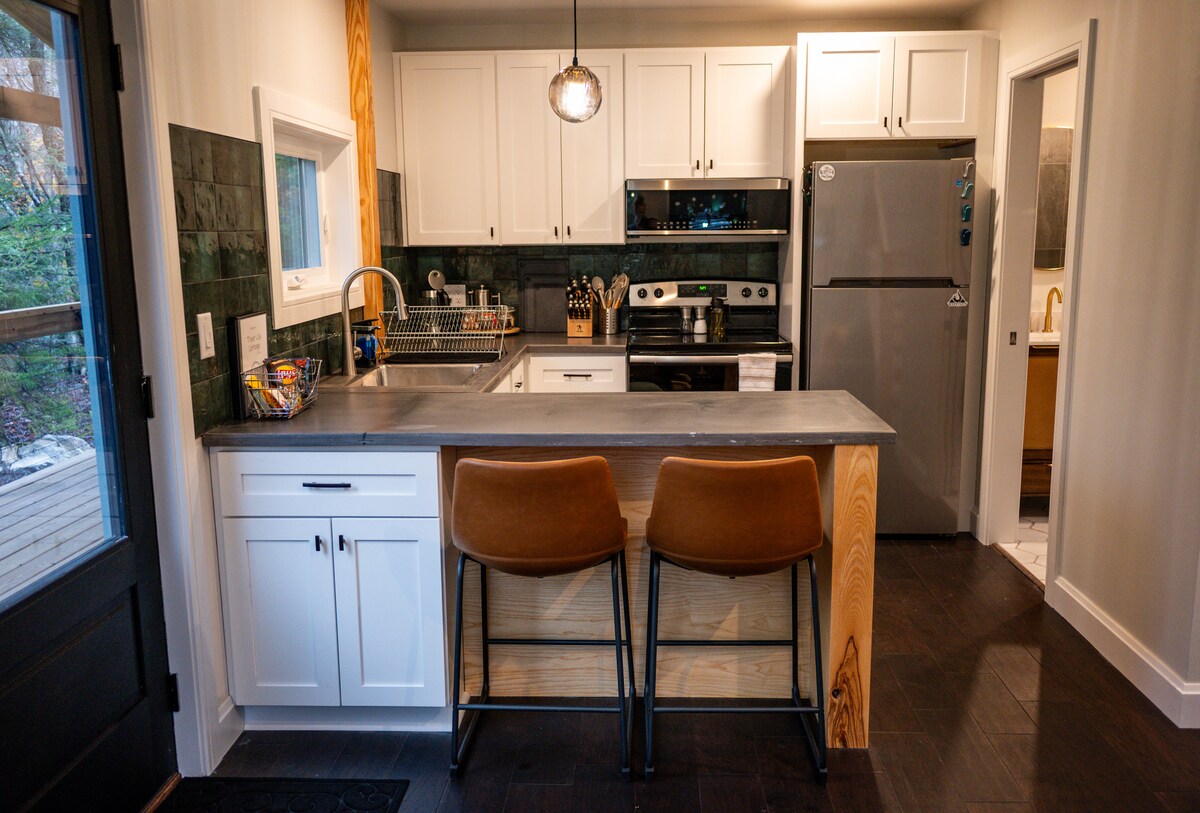I-Creekside iyi-312 square foot (plus loft) eliseceleni le-Tiny Cabin. Ifakwe ehlathini, inezintaba ezibukwayo nezibhakabhaka zasebusuku ezimangalisayo. Umfudlana wezintaba omuhle unyaka wonke ungaphansi kwamamitha angu-50 ukusuka emphemeni wendlu eyakhiwe ngamapulangwe. Indlu eyakhiwe ngamapulangwe yesimanje yayiklanyelwe ukuba ithokomale futhi iheha. Yonke imininingwane "encane" yacatshangelwa. Nakuba indlu eyakhiwe ngamapulangwe ingase ibe nezithombe zesikwele ezilinganiselwe, izwakala ivulekile futhi ayinabantu abaningi.