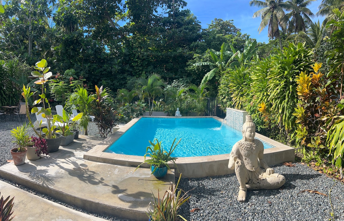 This is a living concept of two individual studios. STUDIO#1 is an open space area of about 1,000 square feet and STUDIO#2 is a two (2) story apartment (700 square feet) with the open bedroom on the second floor and the kitchen, living room and bathroom on the first level. Both STUDIOS have King Bed. Pool (10x20 feet) is connected by a pool deck behind the STUDIOS. Ideal for two small families or small group of friends.