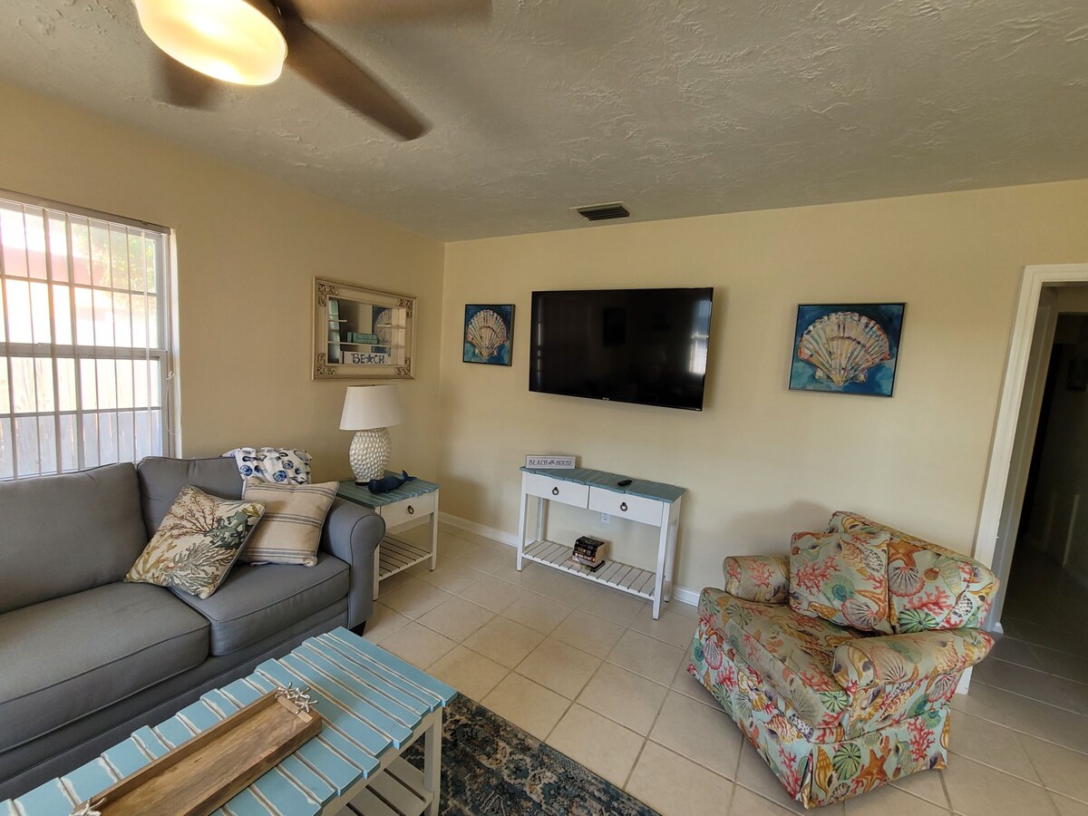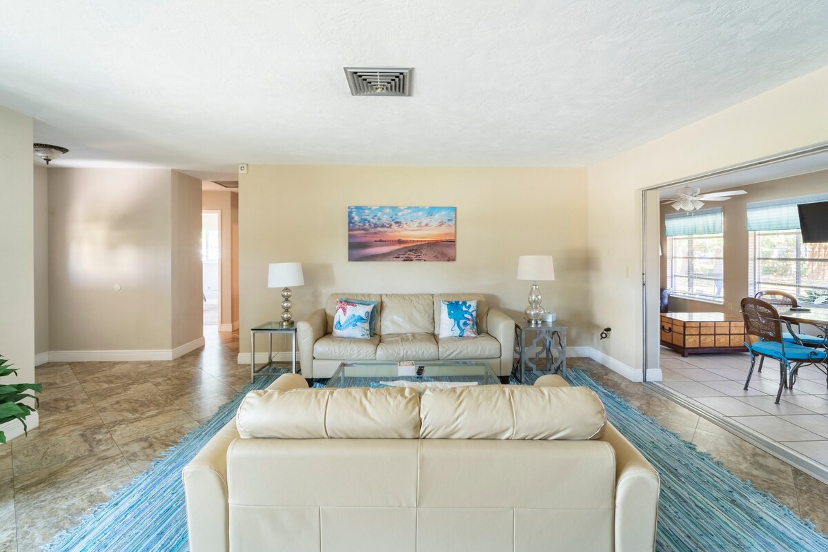 Unwind & Refresh! Our perfect 3/2 getaway is fully remodeled and our cozy retreat rests in the most ideal location for everything Sarasota has to offer! Just 2 mi. to Siesta Key Beach! Beach towels, chairs & toys provided. Grocery, restaurants and unique shops within 1.5 mi. Indulge in watching gorgeous sunsets, walks on the beach, shop/dine in the many cafes in our community. Extras for your use-hammock, outdoor grill, board games, books, large screened in patio. Family neighborhood. Enjoy!
